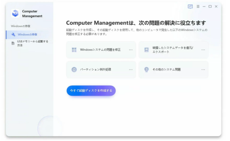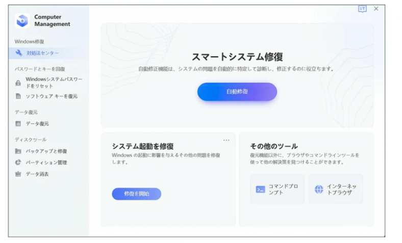 まずご紹介するのは、専用ツールPassFab Computer Managementで修復する方法です。通常の操作では起動できないパソコンを起動させたり、黒い画面のままフリーズする不具合を修復できる強力なツールです。専門的な機能により、様々な原因や状況で発生するWindowsの問題を修復できます。また、分かりやすいガイドやデザインによって、誰でも簡単に使用することができます。