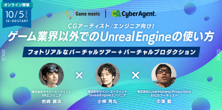 今回のセミナーでは、株式会社サイバーエージェント AI事業本部のXRエンジニア・岩﨑謙汰氏とUnrealEngineエンジニア・小栁秀丸氏、株式会社CyberHuman Productions 3DCGアーティスト中澤 勤氏をお招きし、Unreal Engineの使い方をテーマに、ゲーム業界以外でのUEの活用法や、AI・CG等の技術を用いた新しいクリエイティブ、新しい表現方法について事例を交えながらお話いただきます。