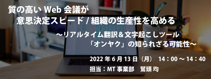 そこで本ウェビナーでは、リアルタイムで外国語翻訳&文字起こしをしてくれる音声翻訳ツール「オンヤク」を使って、Web会議の「質」を高めるソリューションをお届けします。 聞き取りづらい画面越しの声の問題を解消する高度な音声認識、そしてISMS認証のセキュアな国内サーバーで情報管理するオンヤクを使えば、 早口な外国人の発言も難なくキャッチ、機密情報が飛び交うWeb会議にも安心して持ち込めます。