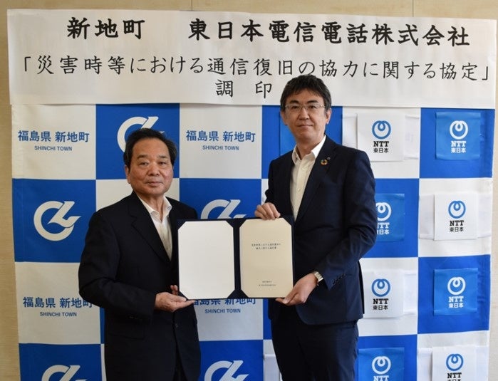 新地町(町長:大堀 武)と東日本電信電話株式会社 福島支店(支店長:畠山 良平、以下「NTT東日本」)は、災害時の相互協力による通信中断の早期復旧に向けた「災害時における通信復旧の協力に関する協定書」を締結しました。