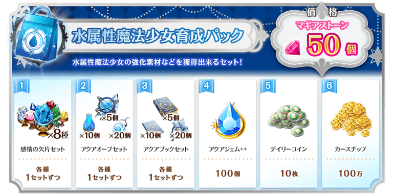 無償を含むマギアストーンで購入できる「水属性魔法少女育成パック(無償)」には以下のアイテムが封入されています。