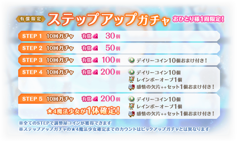 ※STEP5での★4魔法少女について、ピックアップ対象の魔法少女が確定するわけではございません。