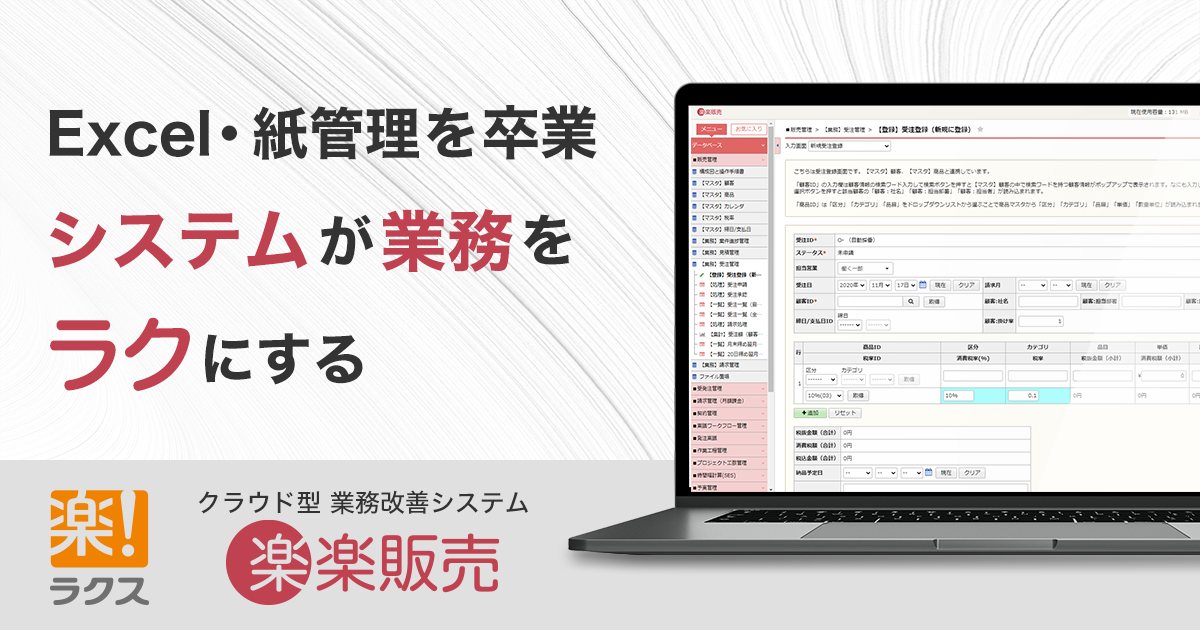 「楽楽販売」は受発注管理、請求管理をはじめとして、あらゆる販売管理業務を効率化することができるクラウド型販売管理システムです。さまざまなデータを一元化してリアルタイムに情報共有することでExcelやメールなどアナログ管理から発生するムダや人的ミスを解消し、業務の効率化を実現します。「楽楽販売」であれば簡単に各種画面や帳票類のレイアウトや請求書などの発行処理を担当者自身で柔軟にカスタマイズができ、パッケージシステムでは自社の業務フローに合わないといったお悩みのお客様にも最適なシステムです。