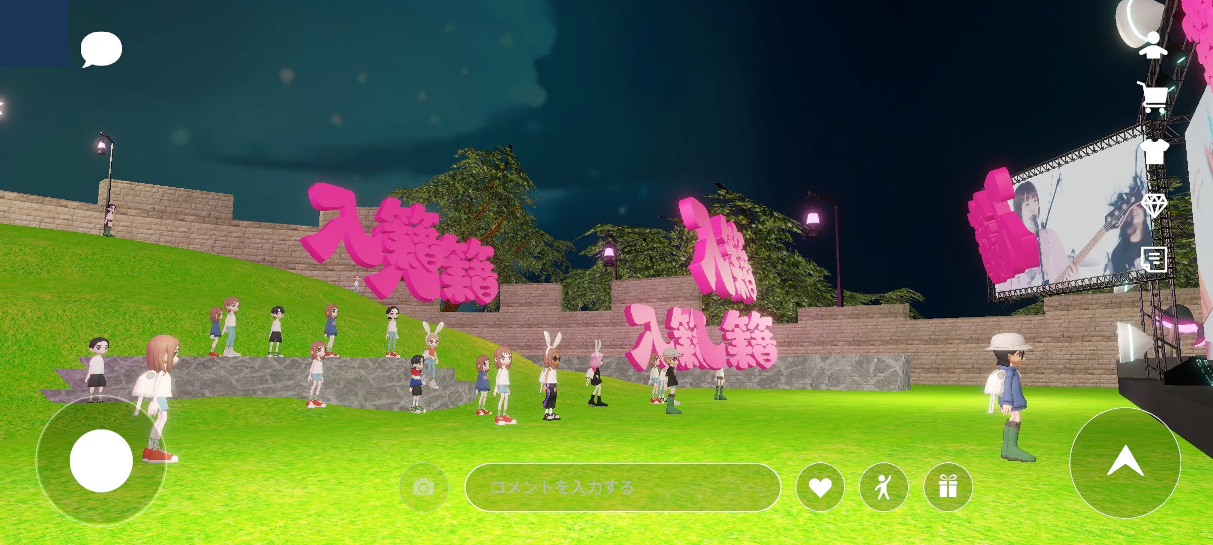 3面の大きなスクリーンがある、いわゆるフェス会場のステージのような“フィールドステージ”と、プラネタリウムのように会場全体に演出を施すことができる“ドームステージ”という2種類のバーチャルステージがある「NeoMe」。観客はアバターとなってそこでライブが楽しめるほか、空間内ではアバターの着せ替えアイテムや限定のデジタルグッズを扱うショップ、アーティストの企画ルームなども展開。今回のヤバイTシャツ屋さんとのコラボとして、バンドのおなじみのキャラクター“タンクトップくん”のグッズやTシャツが揃い、観客は早速、普段のライブ同様にグッズを身につけてライブ会場に集った。なかには、グッズフル装備のツワモノもいるなどアバターもじつに個性豊かだ。