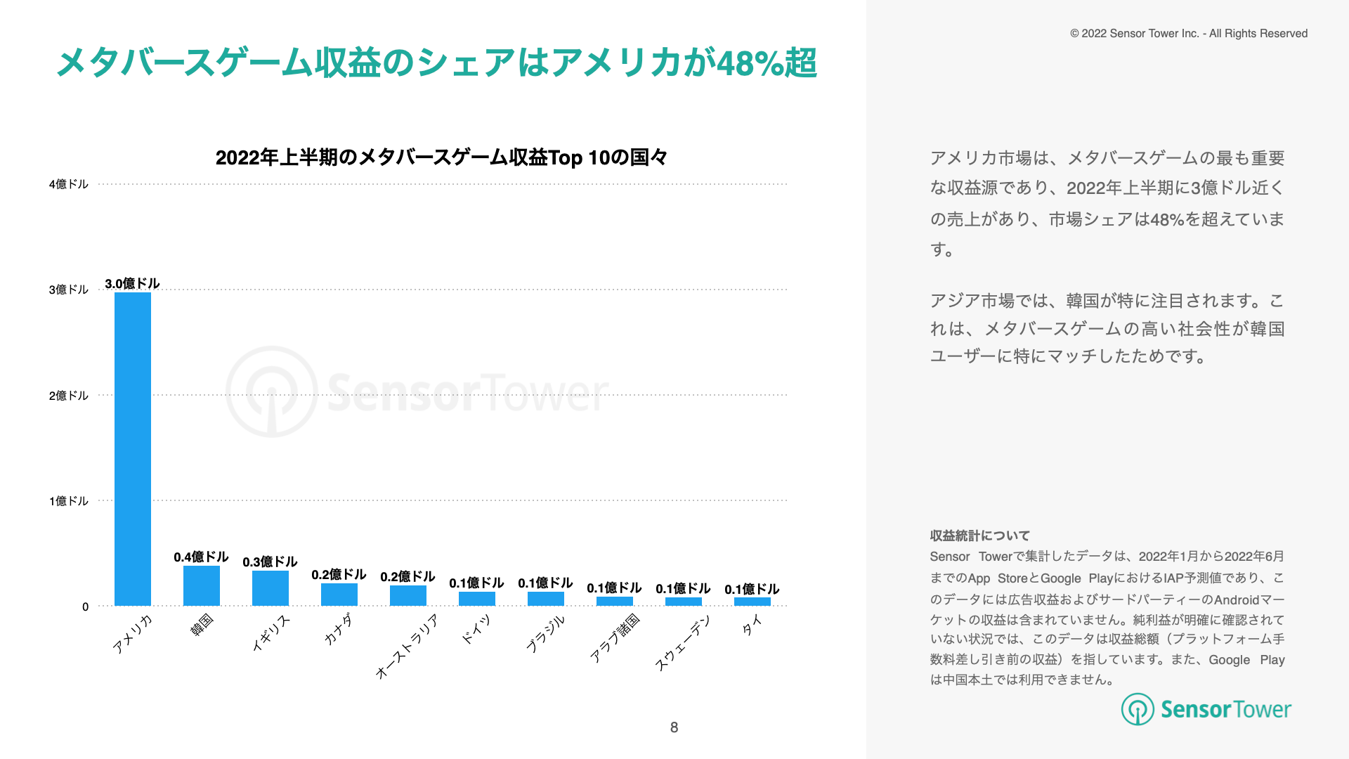 アメリカ市場は、メタバースゲームの最も重要な収益源であり、2022年上半期に3億ドル近くの売上があり、市場シェアは48%を超えています。