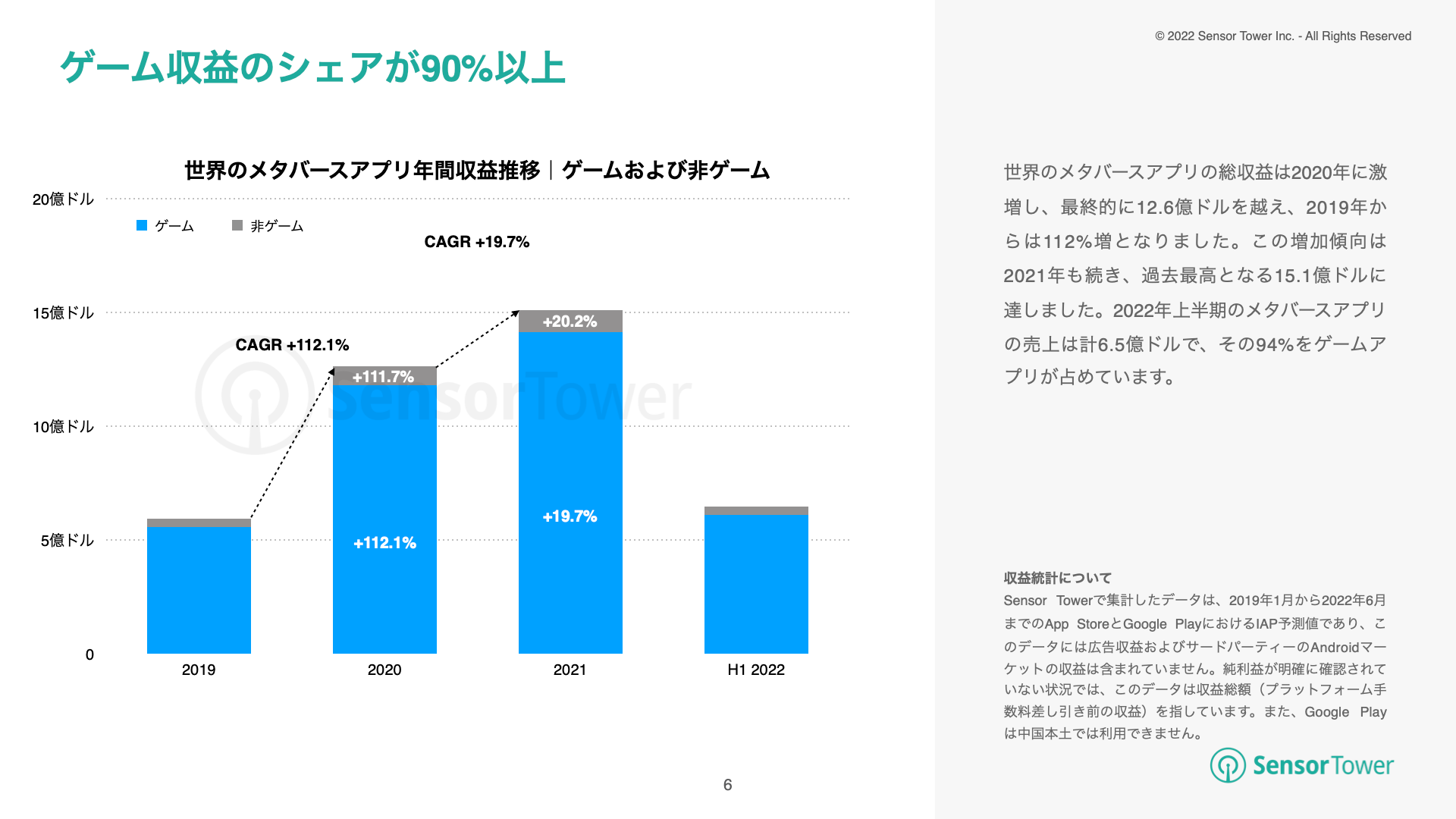 世界のメタバースアプリの総収益は、2020年に激増し、最終的に12.6億ドルを越え、2019年からは112%増となりました。この増加傾向は2021年も続き、過去最高となる15.1億ドルに達しました。2022年上半期のメタバースアプリの売上は計6.5億ドルで、その94%をゲームアプリが占めています。