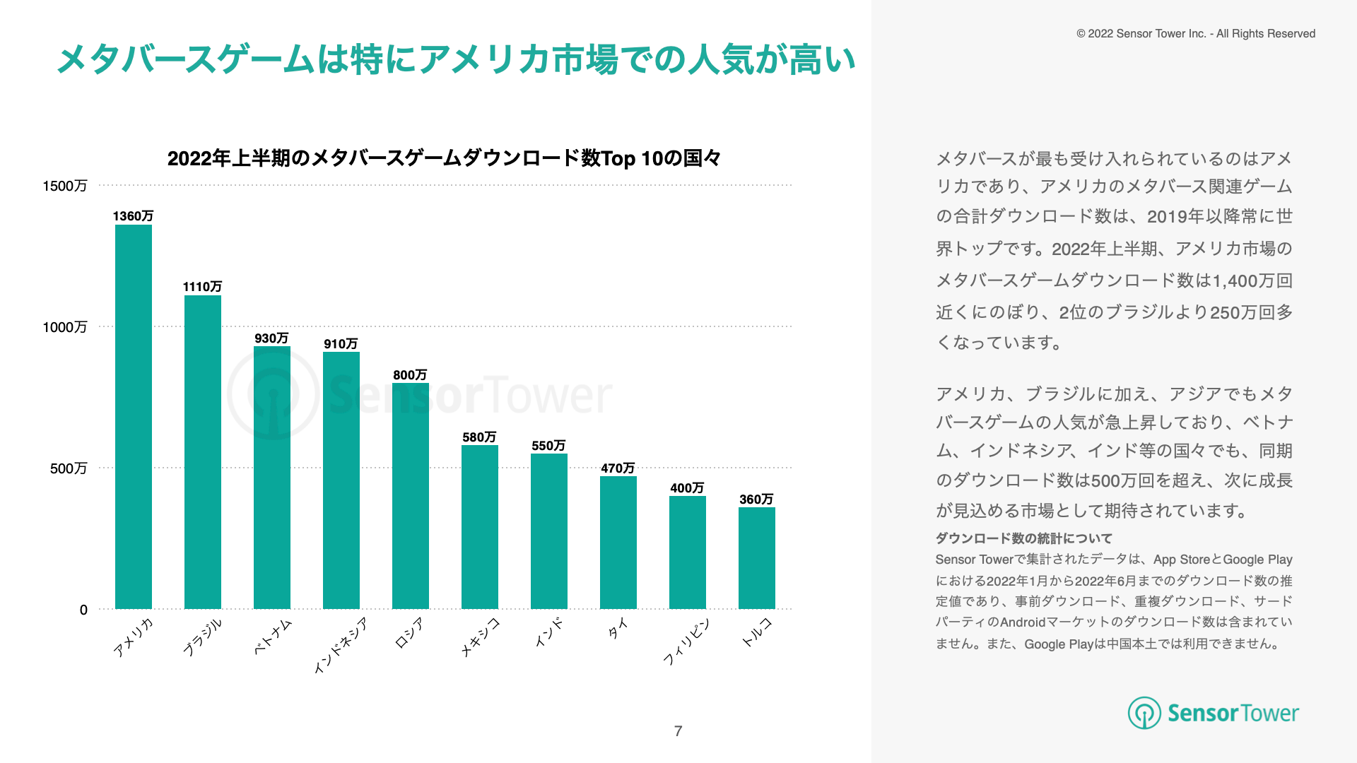 アメリカのメタバースゲームのダウンロード数と収益は、引き続き他の地域をリード