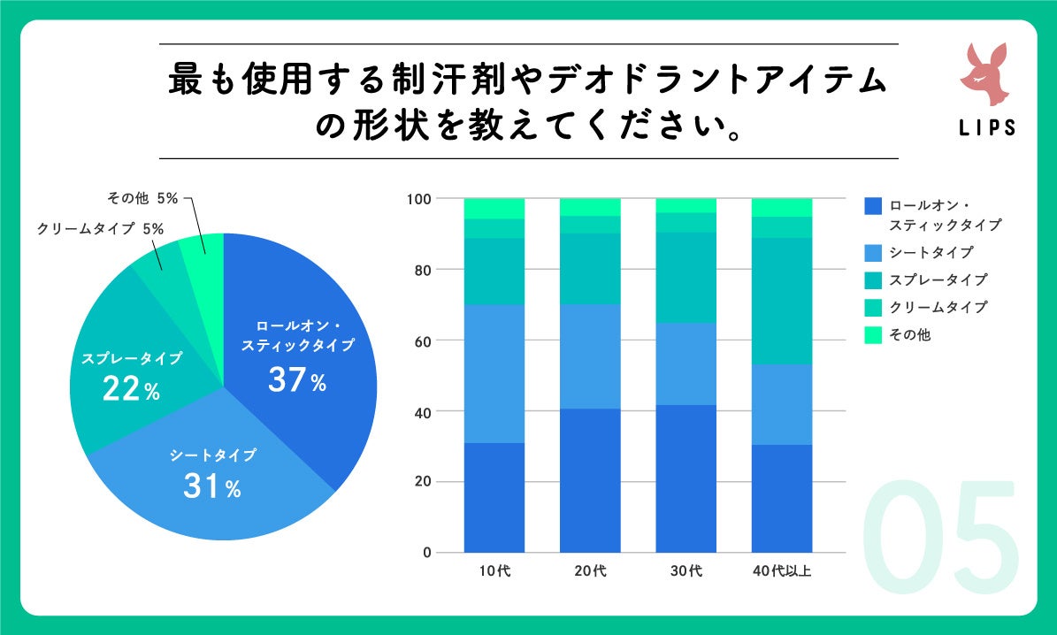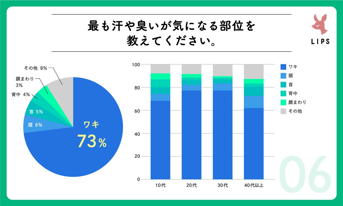 『最も汗や臭いが気になる部位を教えてください』という設問では、全体の73%が「ワキ」と回答しており、ワキに塗りやすい「ロールオン・スティックタイプ」のシェアが高いのは納得です。