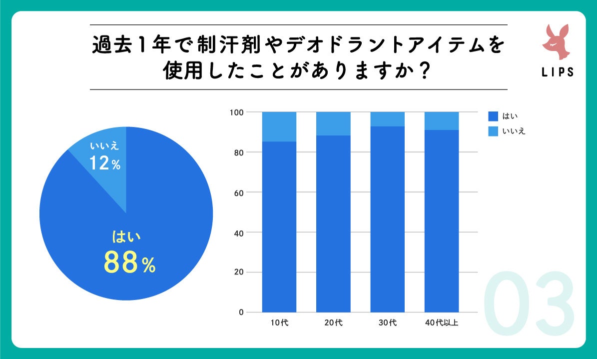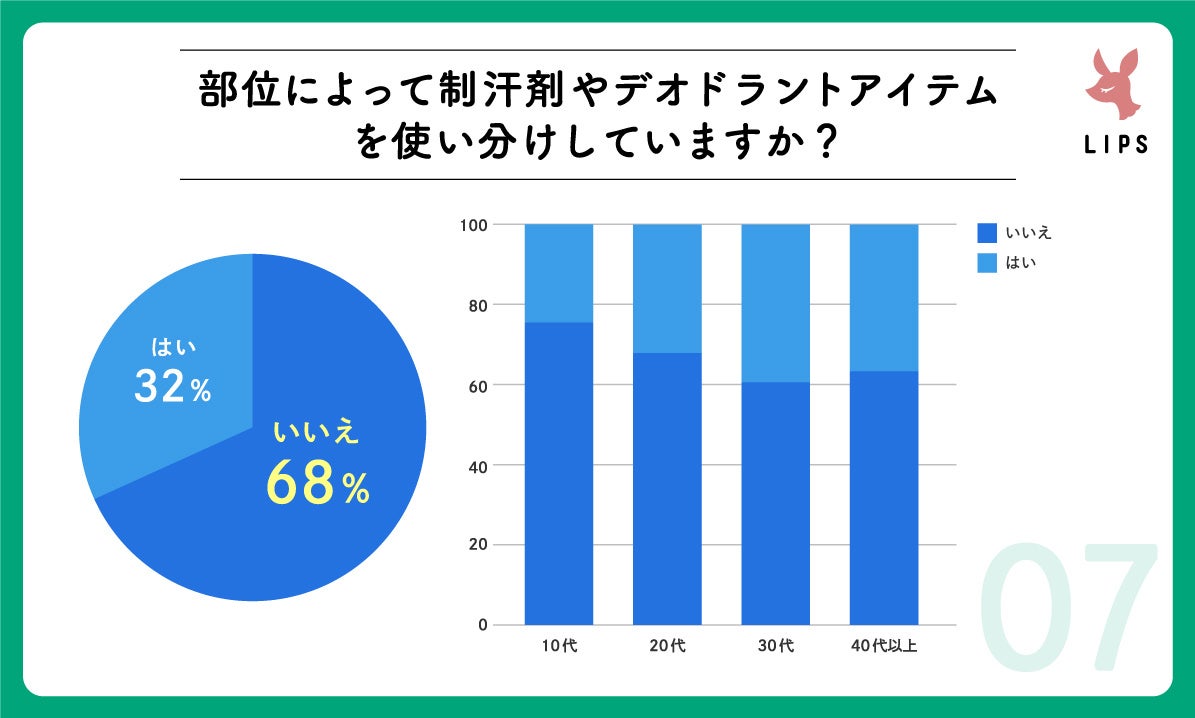 『部分によって制汗剤たデオドラントアイテムを使い分けしていますか?』という設問に対しては「いいえ」が約7割という結果に。