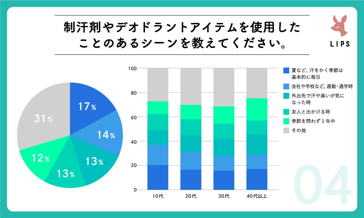 また年代別に見てみると、40代では夏だけでなく季節を問わずに1年中”ニオイ”ケアをしているという人が約2割という結果に。年齢を重ねるごとに臭いが変化することが要因のひとつと考えられます。
