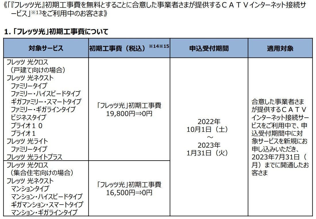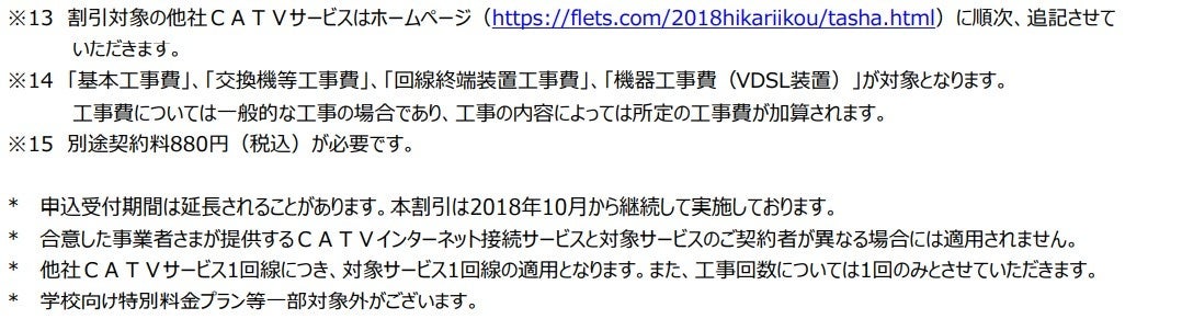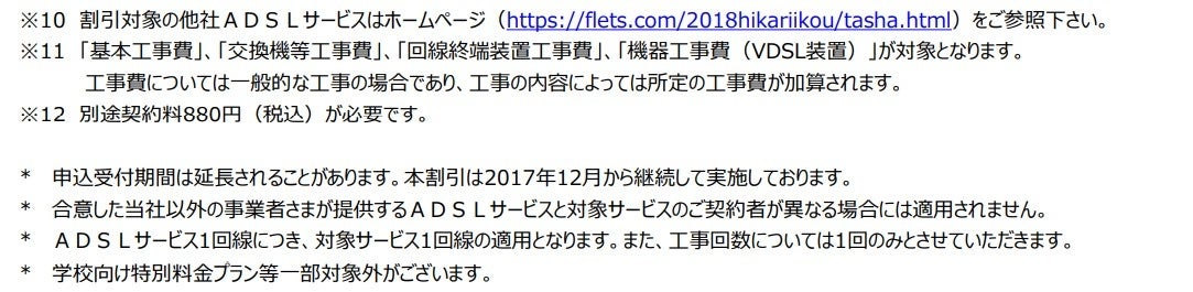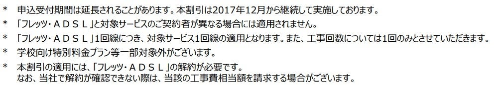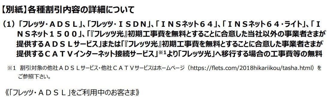 さまが提供するADSLサービス」または 「『フレッツ光』初期工事費を無料とすることに合意した事業者さまが提供するCATVインターネット接続サービス」より「フレッツ光」へ移行する場合の工事費等の無料