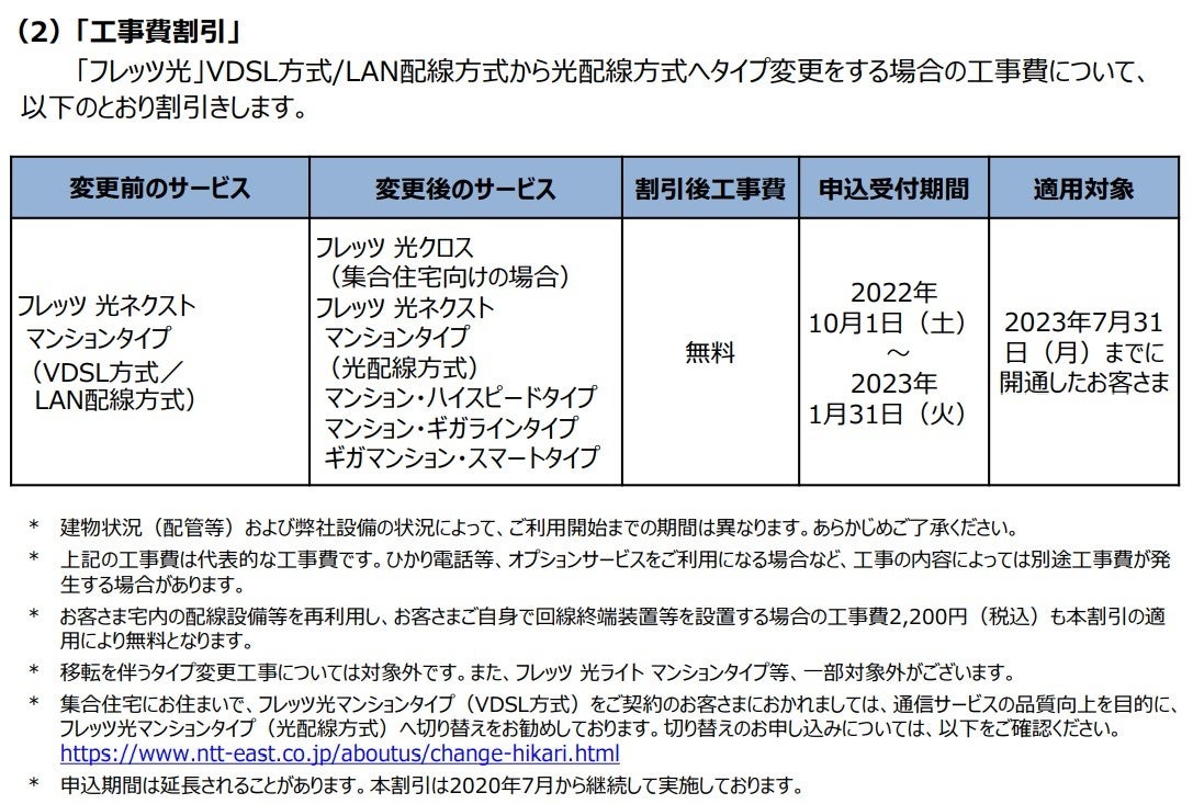 「フレッツ光」におけるVDSL方式/LAN配線方式から光配線方式へのタイプ変更工事費について、割引を適用