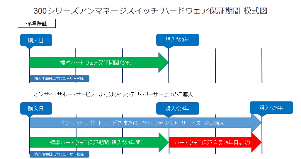 300シリーズアンマネージスイッチ製品に対して、製品購入後5年目までのクイックデリバリーサービスをご購入いただくことが出来ます。