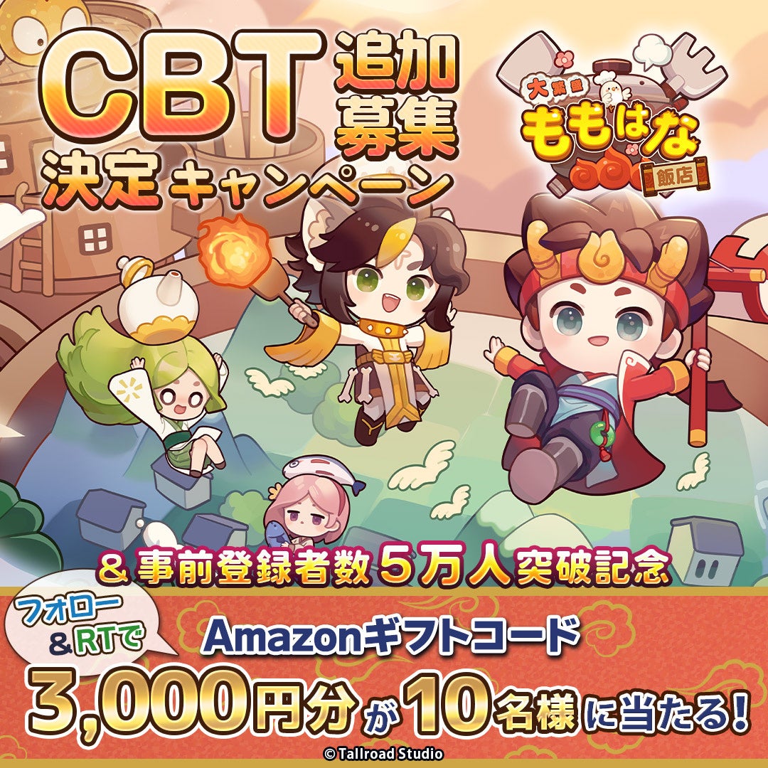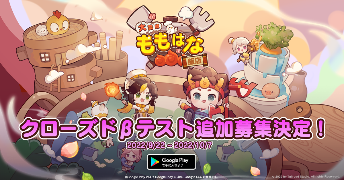 上海のゲーム開発スタジオであるTallroad Studioは、2022年秋に日本で配信を予定しているスマートフォン向け新作ゲーム『大繁盛!ももはな飯店』(ティザーサイトURL:https://pre-registration.chefcarnival.com原題:爆炒江湖)にて現在実施中のクローズドβテスト(以下CBT)のテスト期間延長を決定いたしました。併せてクローズドβテストの新規追加募集を開始したこともお知らせいたします。