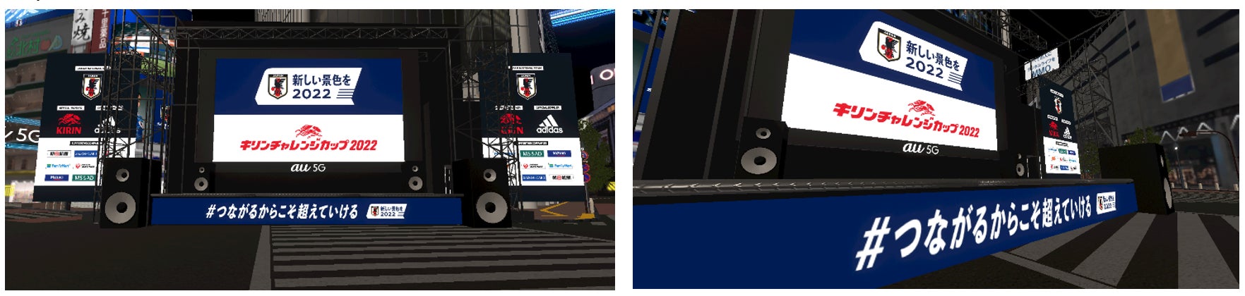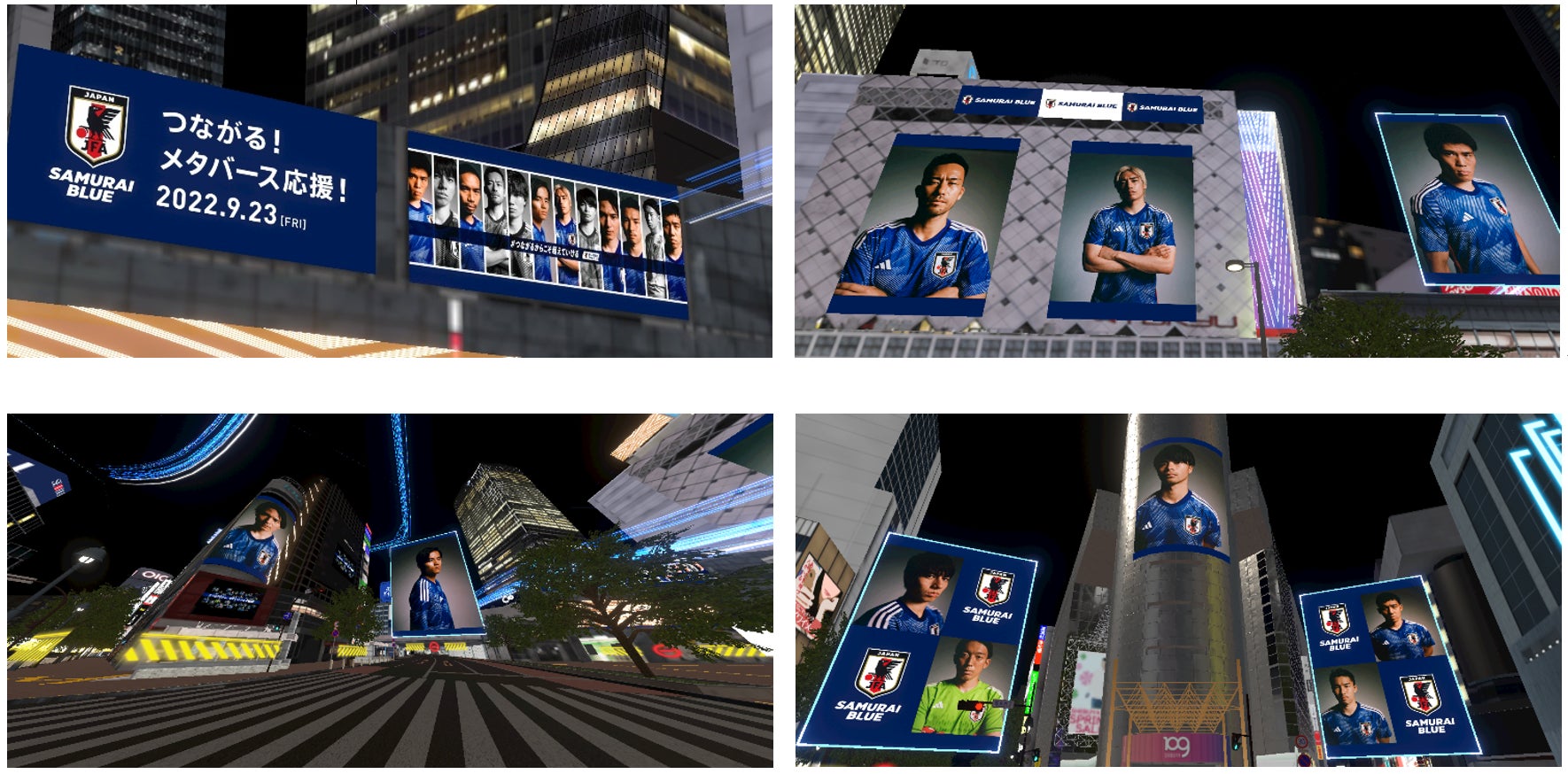 本イベントは、サッカー日本代表スポンサー各社と連携した「新しい景色を2022 つながる!パブリックビューイング」と連動したもので、サッカー日本代表の特別仕様で彩られたバーチャル渋谷のメタバース空間で参加者がつながり、ドイツで戦う日本代表を応援する企画です。