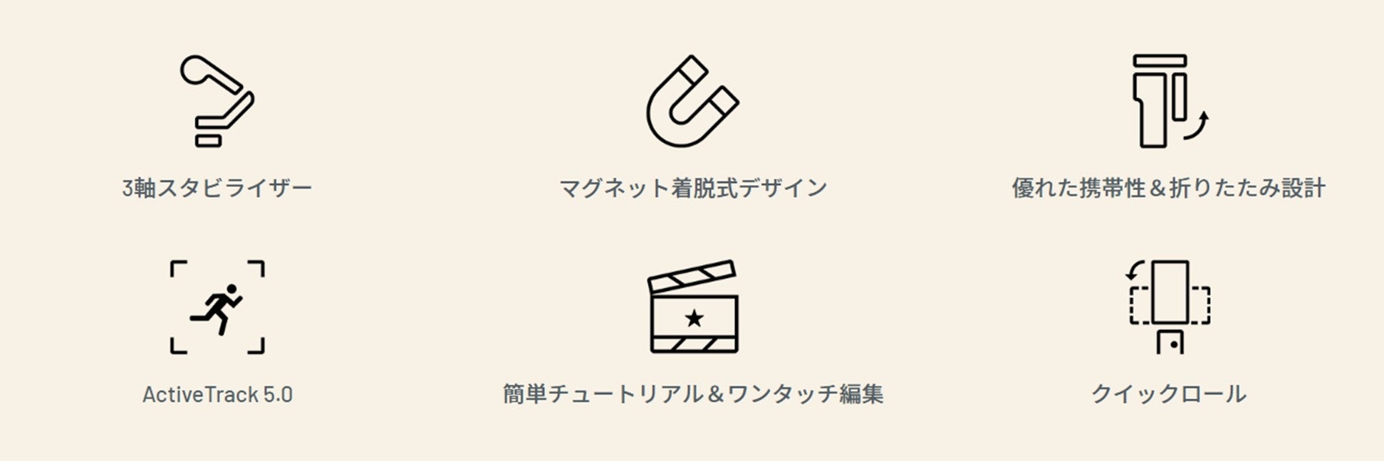 ジンバルを開けば自動で起動、マグネット式のクランプで瞬時にスマホを取り付けて撮影可能。専用アプリがプロのような撮影をサポートするガイド機能や、より広い範囲で被写体を自動で捉える進化したトラッキング機能「ActiveTrack 5.0」で、マニュアルや使い方を覚えることなくもっと自由に撮影が楽しめます。