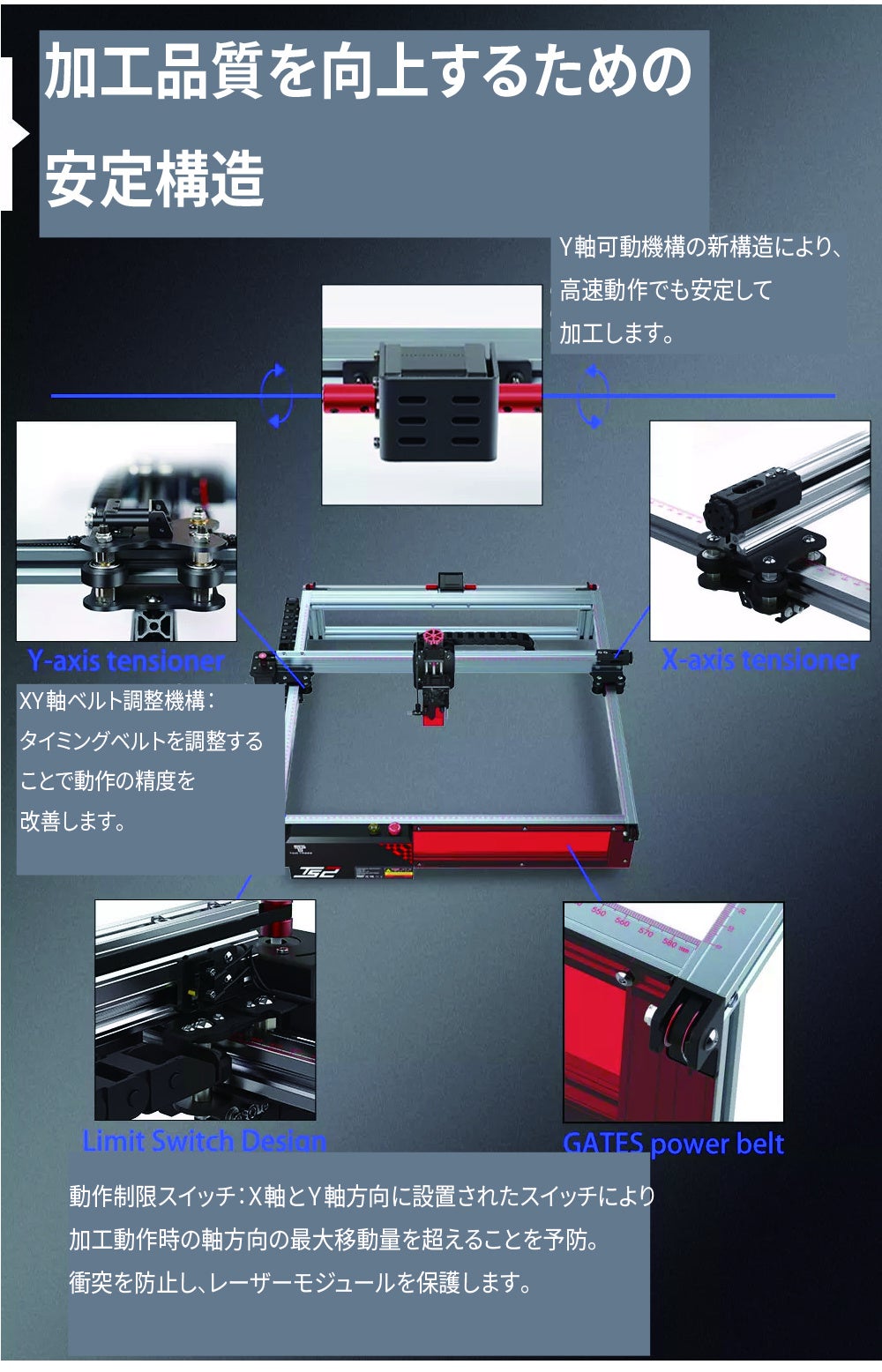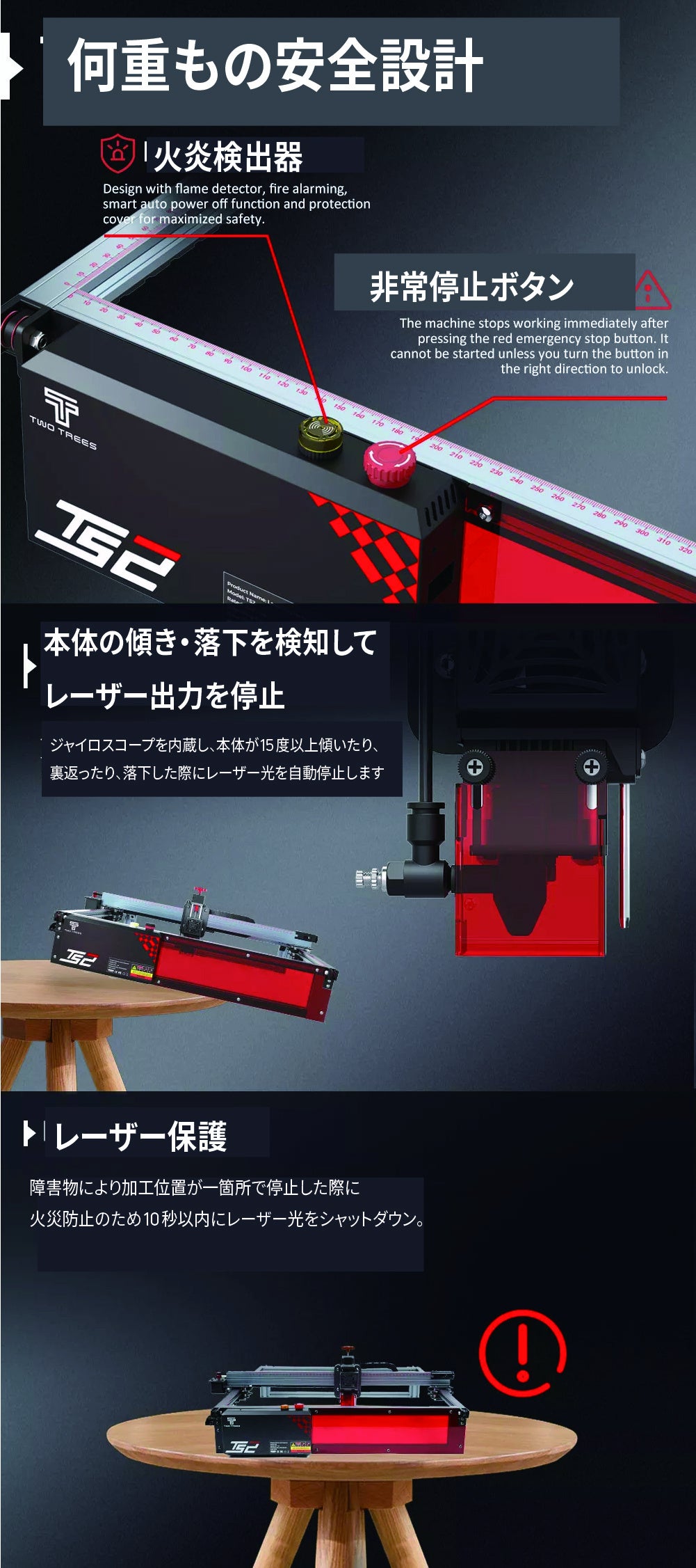 ・安全設計:加工中の火災を検知する火炎検出器、また非常停止ボタンを搭載