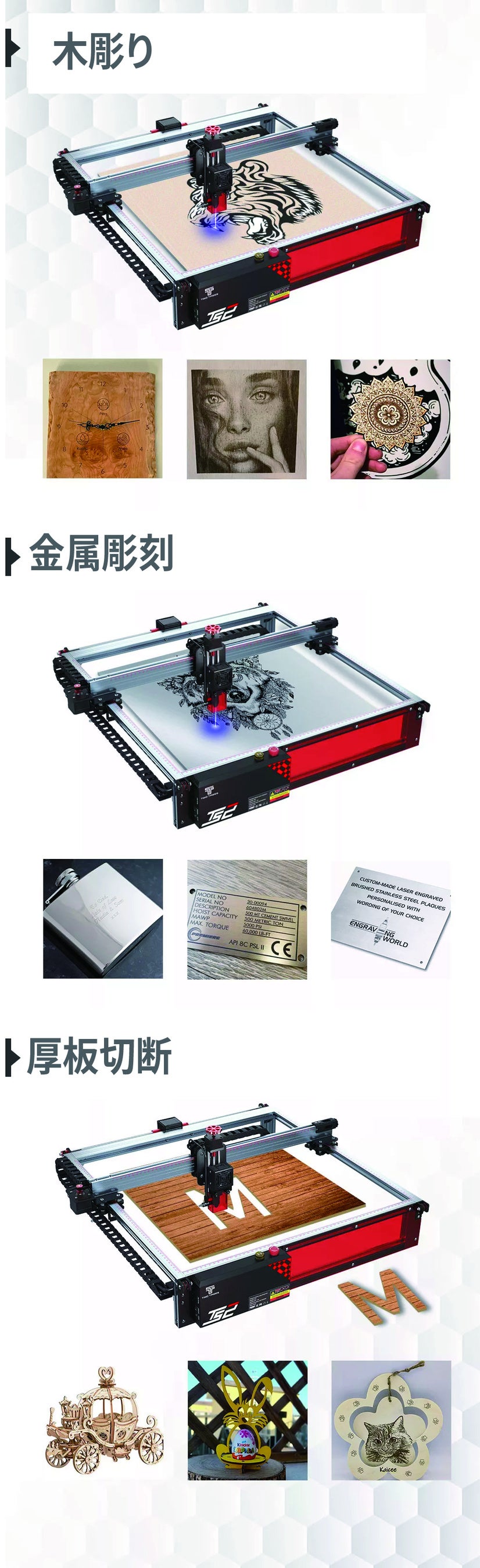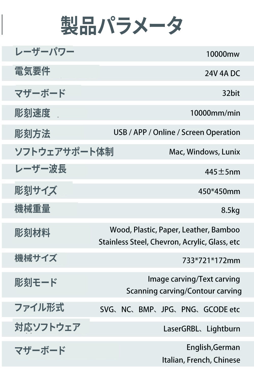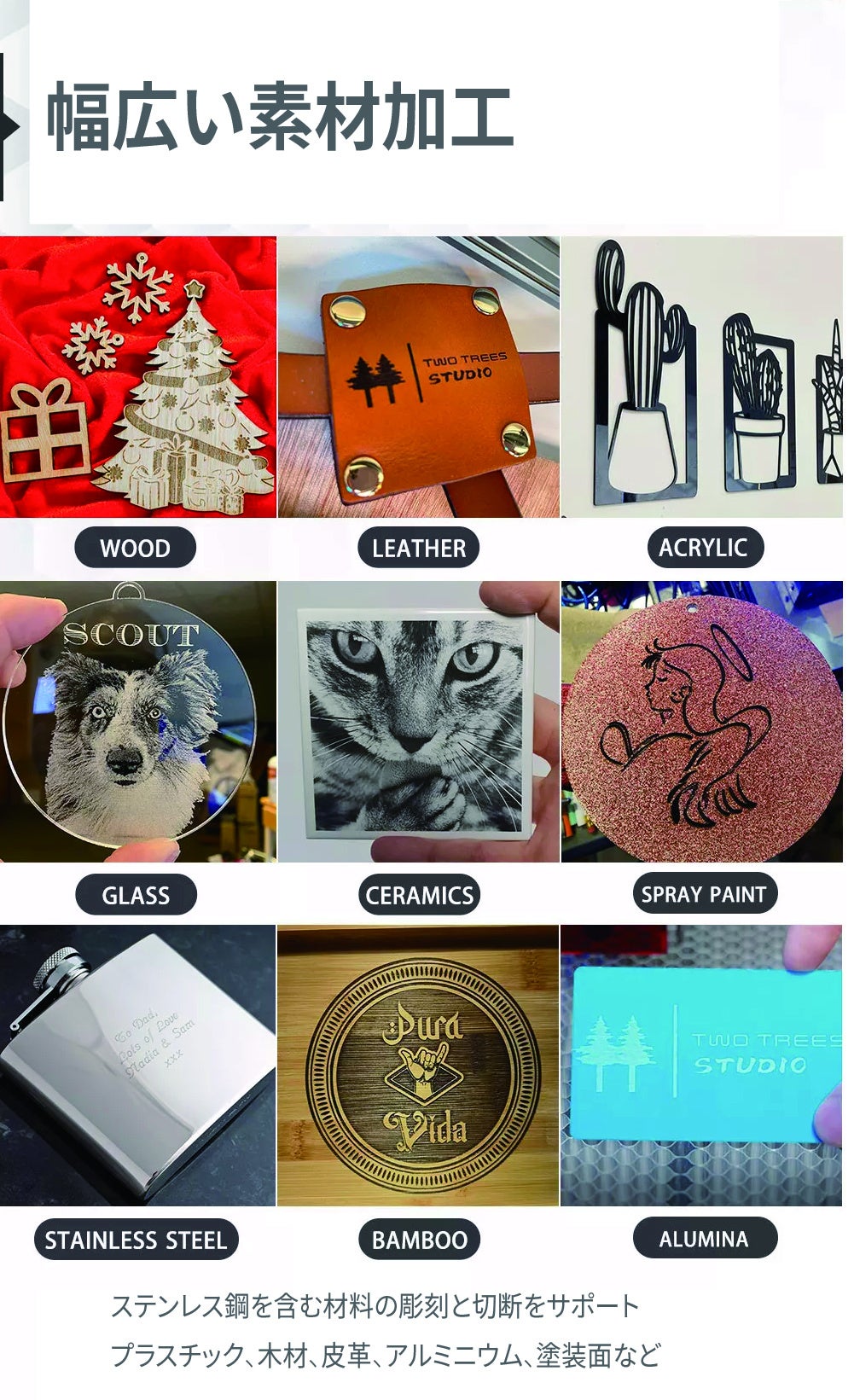 | 適当な材料 | アクリル、ガラス、革、MDF、金属、紙、プラスチック、合板、木材、ステンレス鋼、アルミナ |