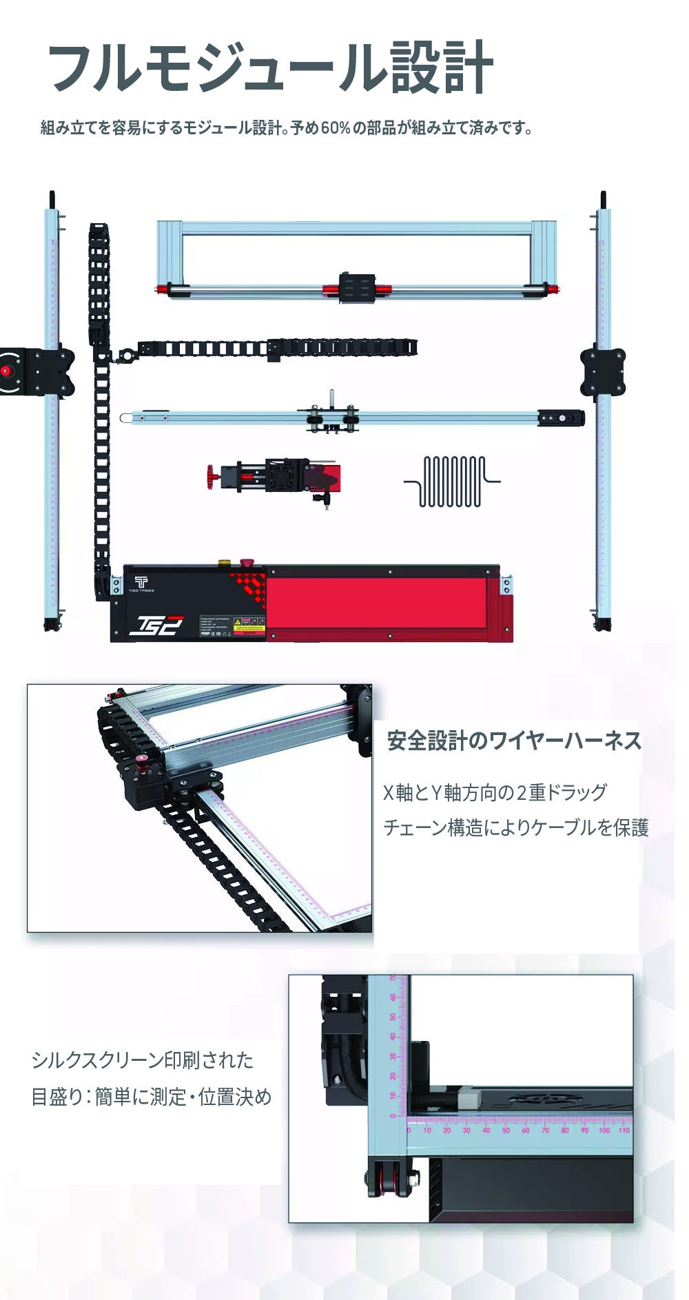 必要な部品の交換やカスタマイズ、メンテナンスがしやすいモジュール式を採用し、自宅や倉庫、作業場など、様々な場所に設置しやすいデザインです。