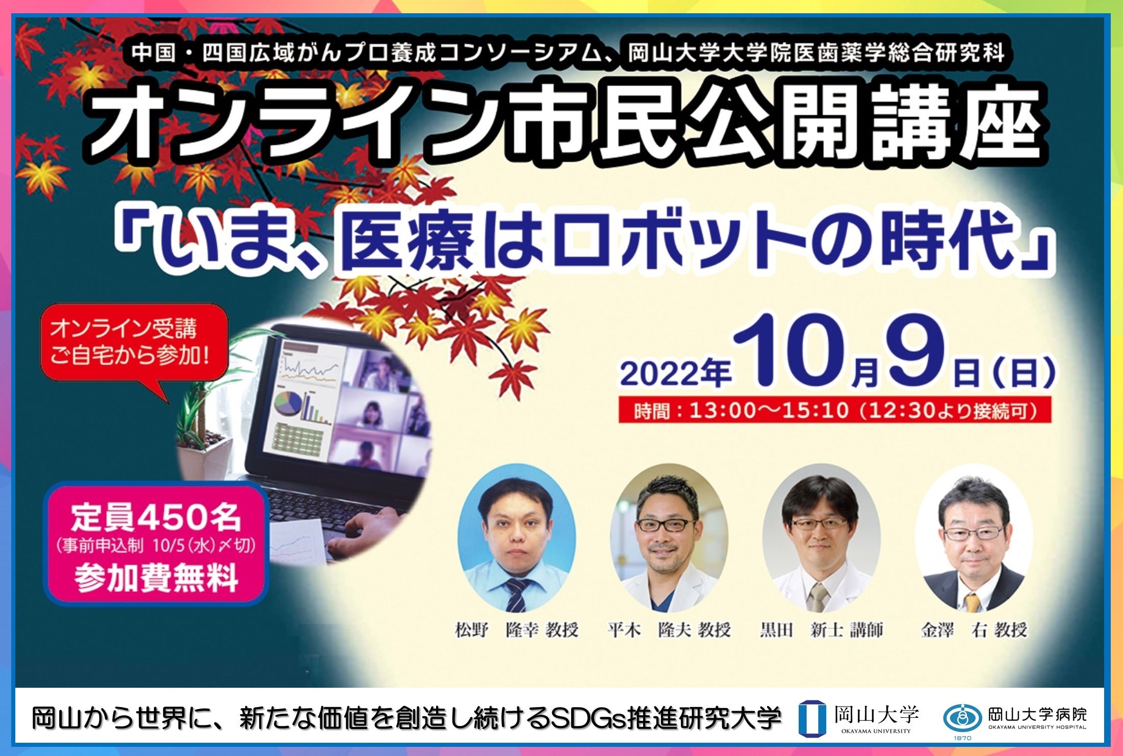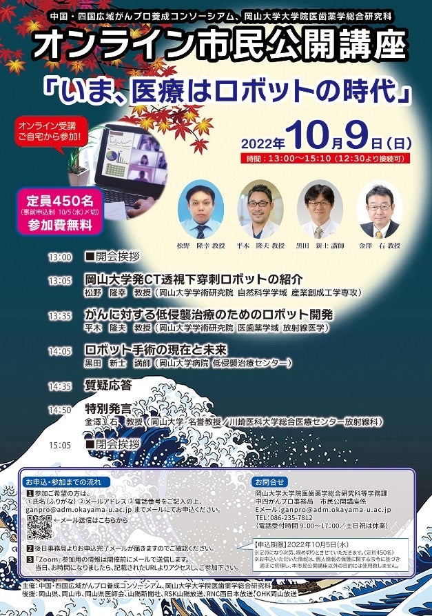 今回、中国・四国広域がんプロ養成コンソーシアム オンライン市民公開講座「いま、医療はロボットの時代」を、2022年10月9日(日)13:00~15:10オンラインで開催します。