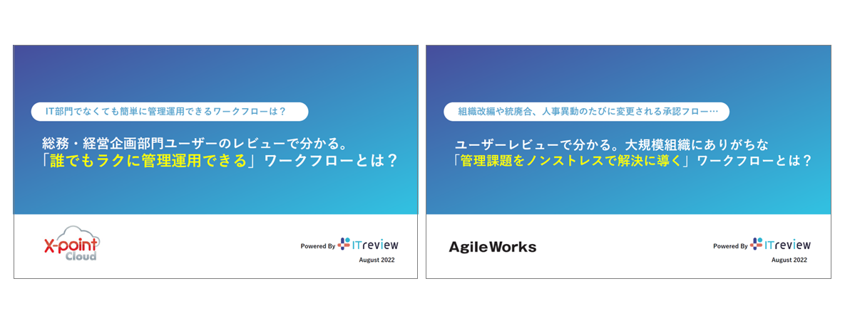 国内最大級の IT製品/SaaSのレビューサイトである「ITreview」に投稿された、ワークフロークラウド「X-point Cloud」、ワークフローシステム「AgileWorks」それぞれのレビューから浮かび上がる、製品の強みや評価、実際に利用しているからこそ分かるポイントについてまとめています。