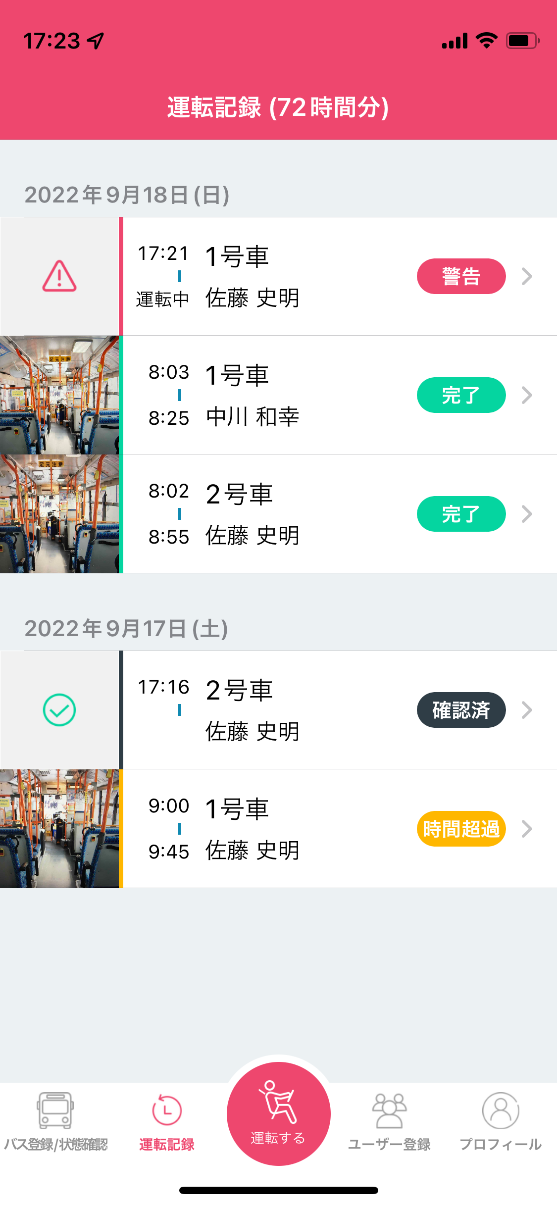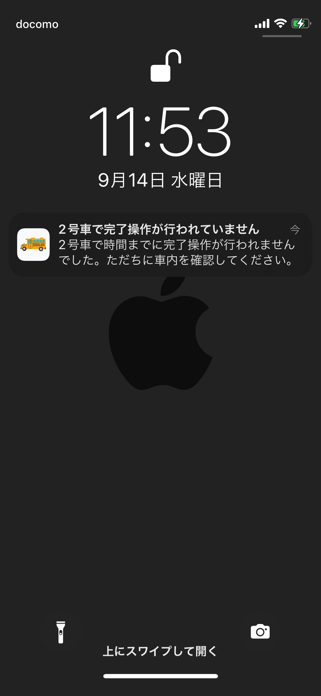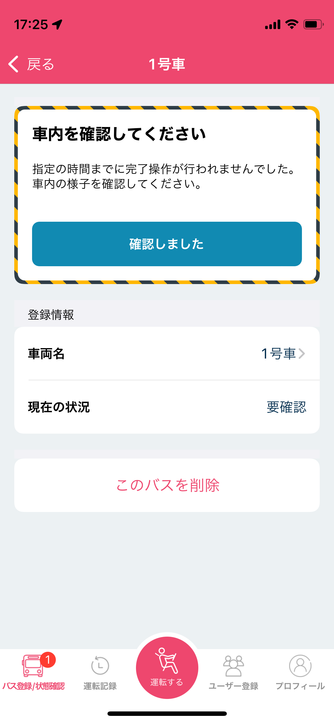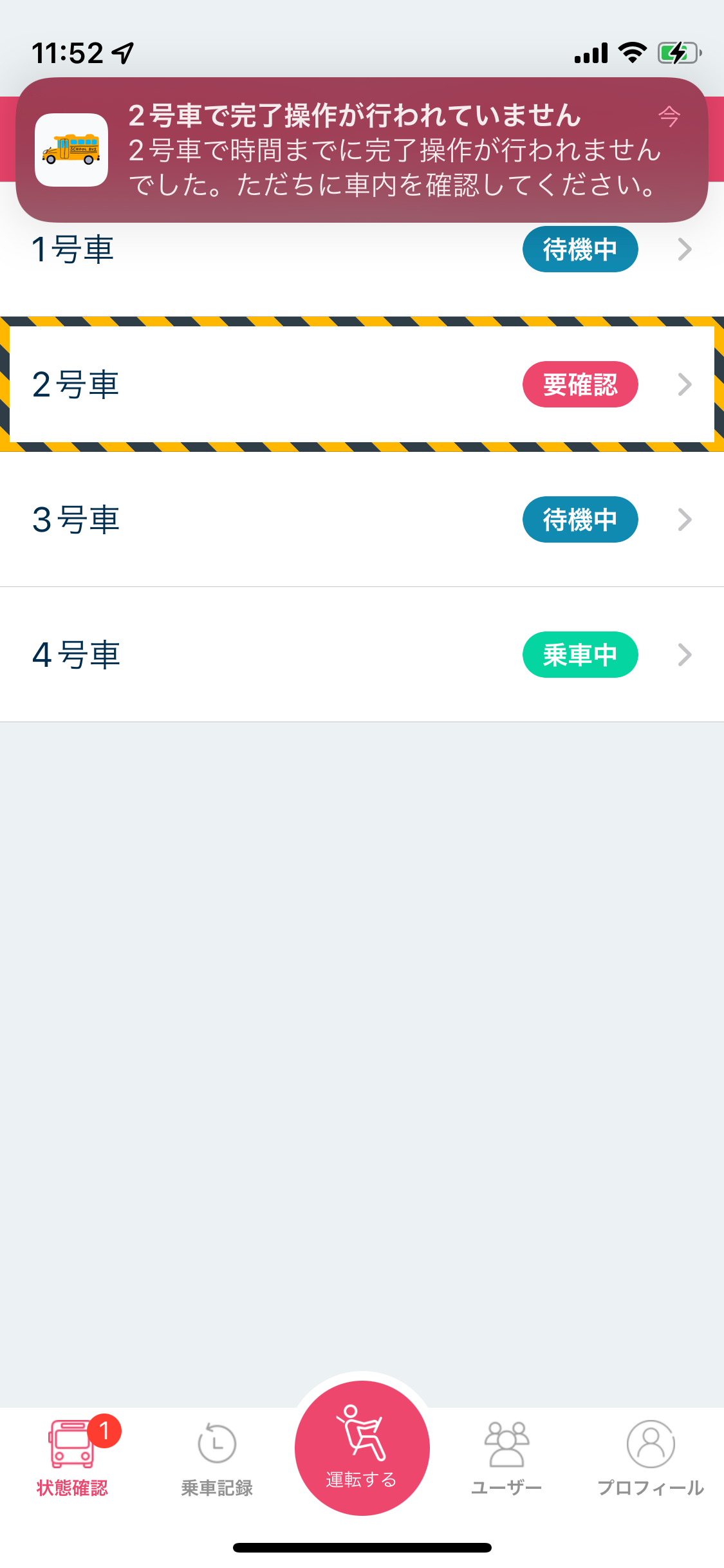 出発ボタンを押した後、設定されたタイマーの時間内に車内の写真が撮影・アップロードされない場合は、どのバスの車内の確認が終わっていないかをつたえる警告が、その団体内の全ユーザー対して通知され、置き去りのリスクを伝えます。