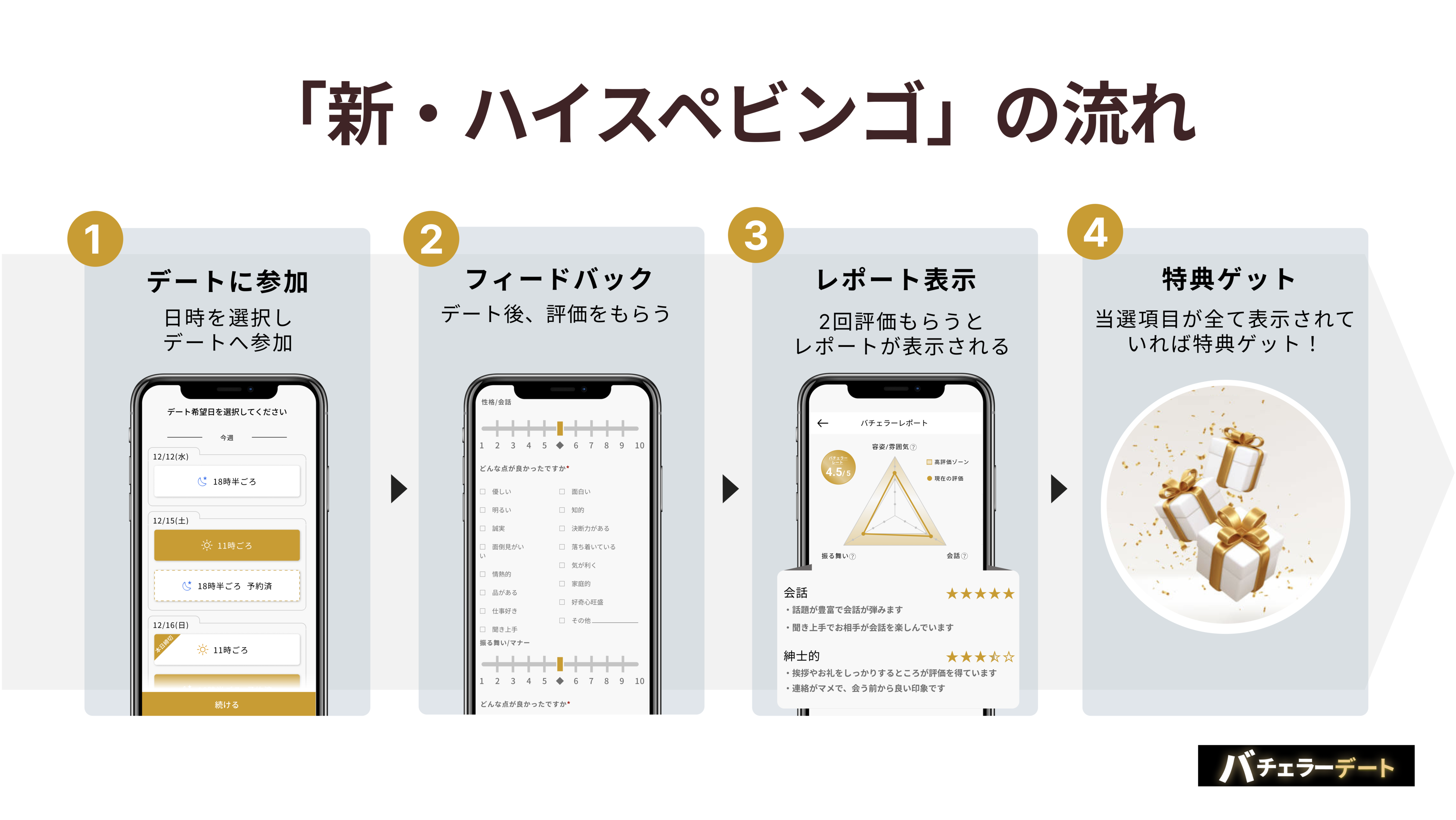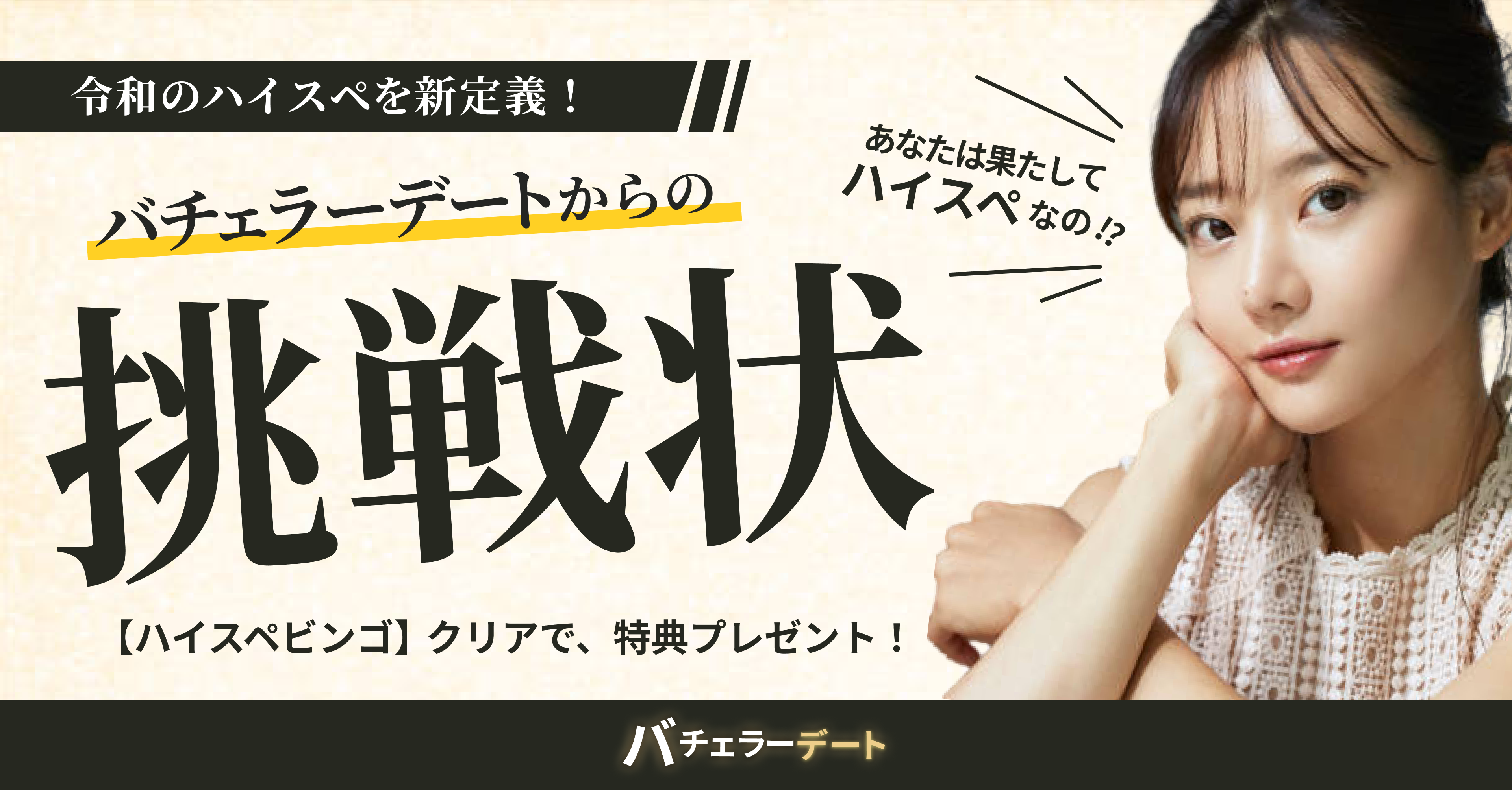 バチェラーデートでは現在数十万人を超えるユーザーに登録頂いておりますが、今回の調査結果と同様に女性から高評価を受けている男性の8割は会話やマナーについて特に高く評価を受けていました。そこで、バチェラーデートでは『令和版・新ハイスペ』定義に該当する恋活・婚活男性を応援すべく、2022年6月1日(水)より、デート後のお相手女性からのフィードバックにて、2022年度版に新たに定義されたハイスペ3要素のうち2つ「コミュ力」「マナー力」について高く評価を得た男性ユーザーに対し、デート応援金が当たる「新ハイスペビンゴ」キャンペーンを実施します。これによりユーザーの皆様によりデートを楽しんで頂き、さらに恋愛力UPに繋げて頂ければと考えております。