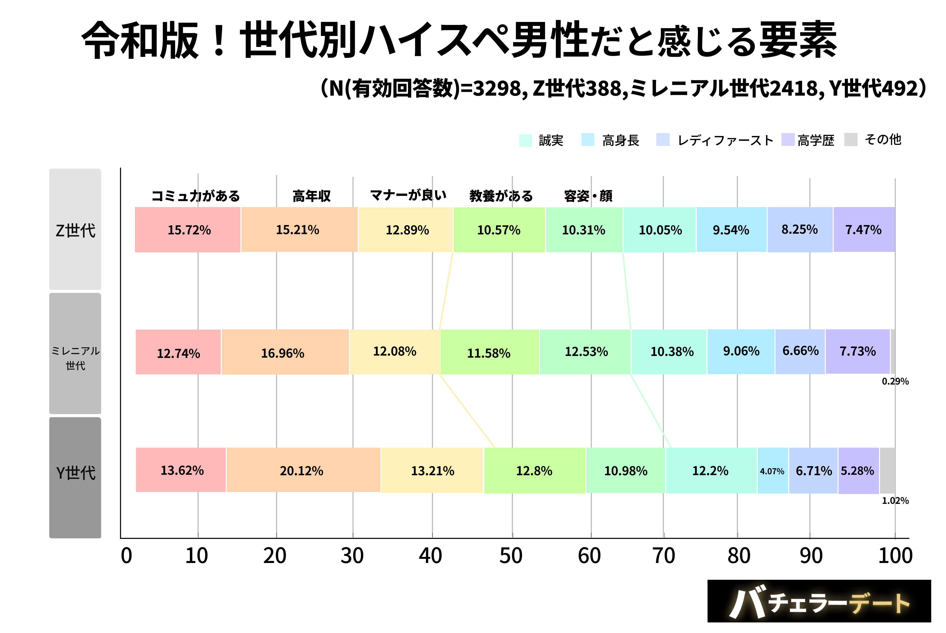 また、ミレニアル世代で3位、他世代でも僅差で上位に入っている容姿については「高学歴高年収に加えイケメンは少数だから」などの意見があり、容姿が整っていることに希少性を感じ、ハイスペ男性として捉えていると考えられます。