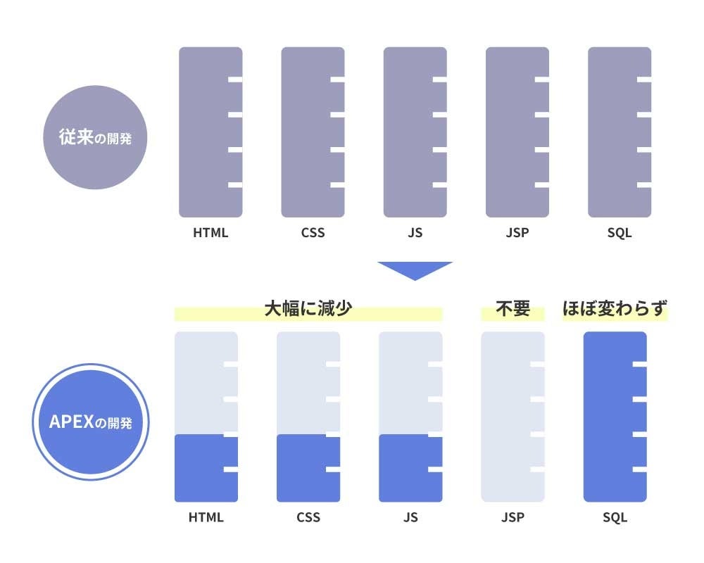 「Oracle APEX」は、フロントエンドのウェブデザイン構築から、バックエンドの認証基盤・API・データベース構築まで幅広い開発が可能です。
