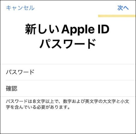 5.新しいApple IDのパスワードを入力し、「次へ」を選択します。