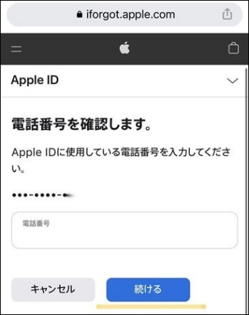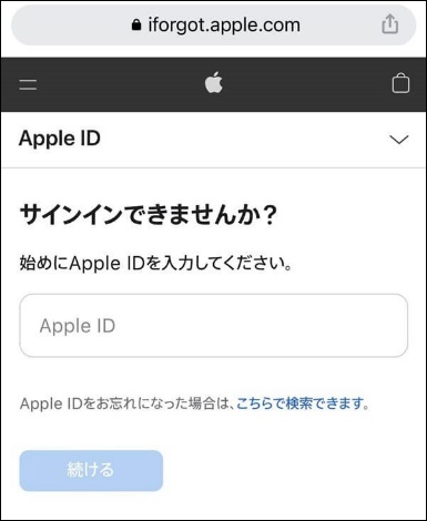 1.https://iforgot.apple.com/ で、Apple IDを入力して、「続ける」を選択します。