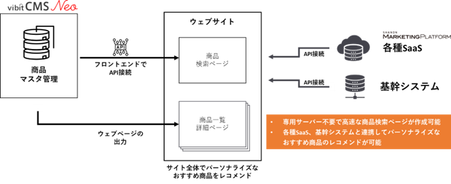 「見たままヘッドレスCMS機能」が追加されたvibit CMS Neoを使うと、数万点を超える製品マスタ情報であっても、複雑な検索や複数ページでの参照が可能になります。さらに「SHANON MARKETING PLATFORM」や既存基幹システムと連携することで、顧客情報や特性に合わせた商品の掲出が実現します。