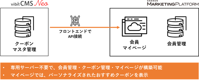 シャノンが提供するMAツール「SHANON MARKETING PLATFORM」を活用すると、お客様の個人情報やグレードなどの会員情報が管理可能になります。ここにvibit CMS Neoを組み合わせることでクーポンマスタを「コンテンツDB」で一元管理し、「見たままヘッドレスCMS機能」で会員情報の属性ごとに異なるクーポンを表示・おすすめするWebページの作成が可能です。これにより取り扱いクーポンの増加によるクーポン情報の管理や更新業務が容易になります。