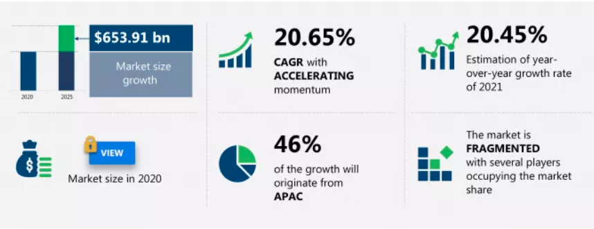 「モバイルアプリケーション市場動向と予想」レポートによると、モバイルアプリ市場のシェアは2020年から2025年にかけて6539億1000万ドル増加し、市場の勢いは年平均20.65%でますます加速していくと予想されています。理由として、スマートフォンの普及率の増加や、新型コロナウイルスの流行により在宅時間の増加によりモバイルアプリの需要が高まっていることが考えられます。