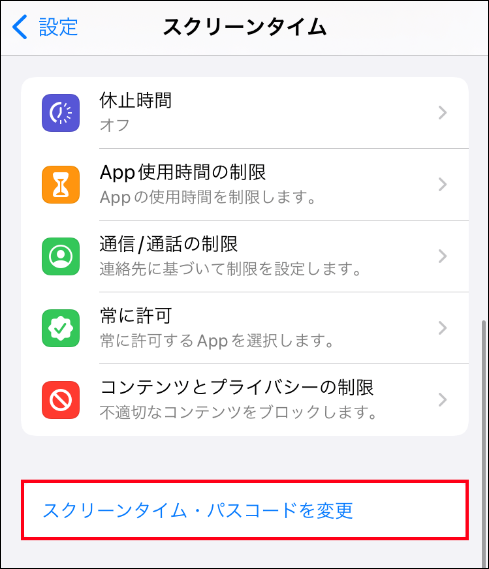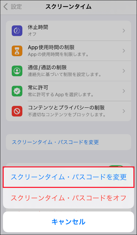 - 「スクリーンタイム・パスコードを変更」をタップします。