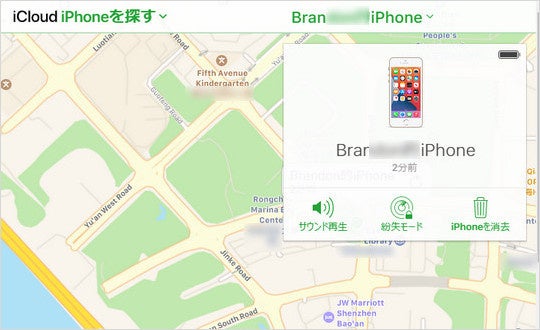 「すべてのデバイス」>「iPhone」と進み、「iPhoneを消去」を選択します。