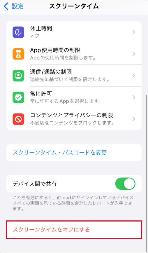 - 画面下部の「スクリーンタイムをオフにする」をタップします。