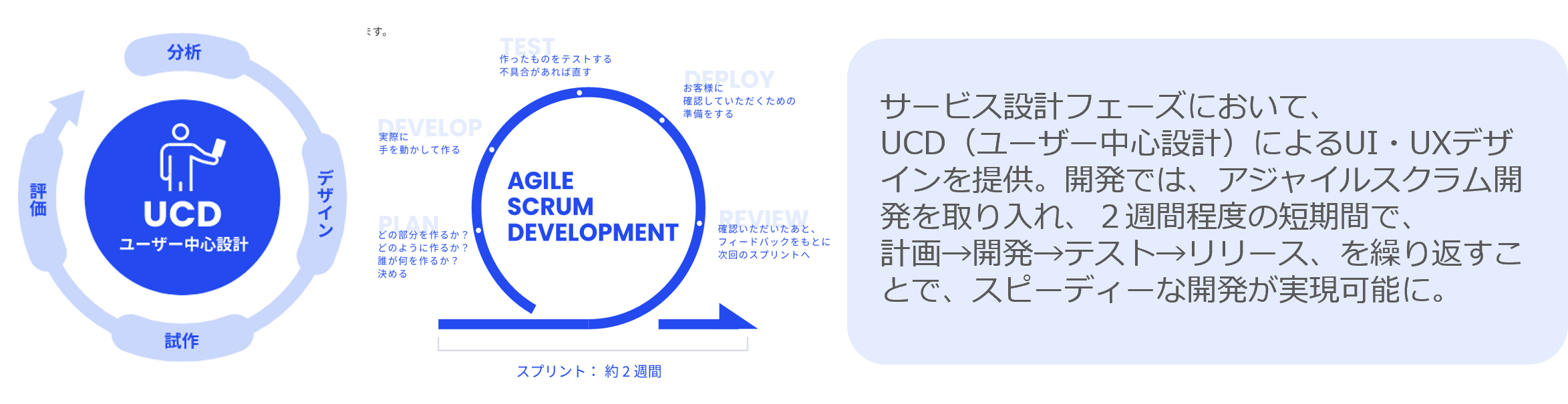 当社の提供するサービスは、日本とベトナムのリソースを融合させ、顧客のビジネスとテクノロジーという両側面からDXを推進する「ハイブリッド型サービス」です。ハイブリッド型サービスにおいては、コミュニケ―ションの仲立ち役である、日本人PMとベトナム人PMの豊富な経験から、従来のオフショアでありがちなコミュニケーションの齟齬などを防ぎます。実際のサービス設計フェーズにおいては、UCD(実際にサービスを利用するユーザーの使い方を元にデザイン・インターフェイスを作成)によるUI・UXデザインを提供し、実装のフェーズではアジャイルスクラム開発を取り入れ、計画、開発、テスト、リリースを繰り返すことにより、高品質かつスピーディな開発を実現します。このように、サービス設計からエンハンスまでワンストップでサービスを提供することで、顧客に貢献いたします。