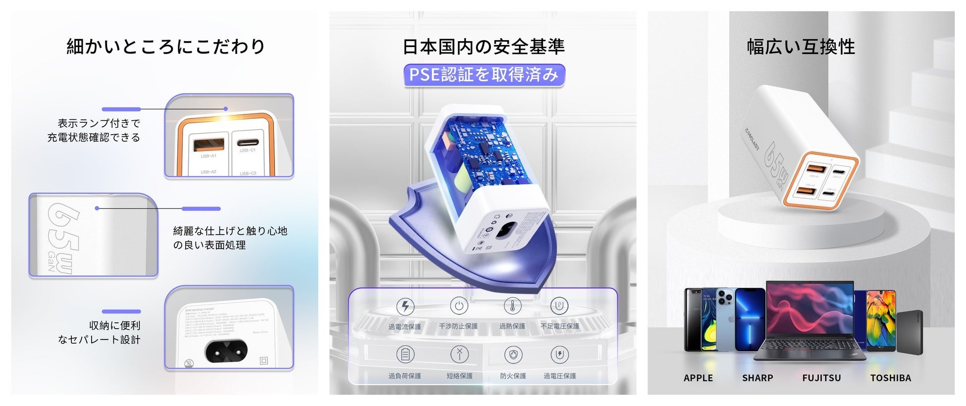 – PSE認証済み・保護機能搭載:電気用品安全法のPSE技術基準の敵合品で安全性はもちろん、「過電流保護」、「過電圧保護」、「過熱保護」、「短絡保護」などの8つ安全保護機能を搭載しており、ご安心に長時間お使いいただけます。また、スマートな電力配分機能の搭載で、接続デバイスの充電規格を自動的に識別し、最適な電流を配分でき、パワーフル充電する同時に最大限でデバイスを保護します。
