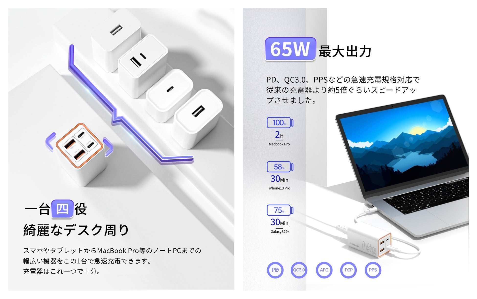 – 65W PD対応充電器:USB-C単ポートは最大65Wの高出力を備え、PD(Power delivery)3.0、QC3.0、PPSなどの急速充電規格対応で、従来の充電器より5倍ぐらいスピードアップさせました。約2時間でMacBook Proが満充電になり、わずか30分でiPhone13が50%まで充電できます。