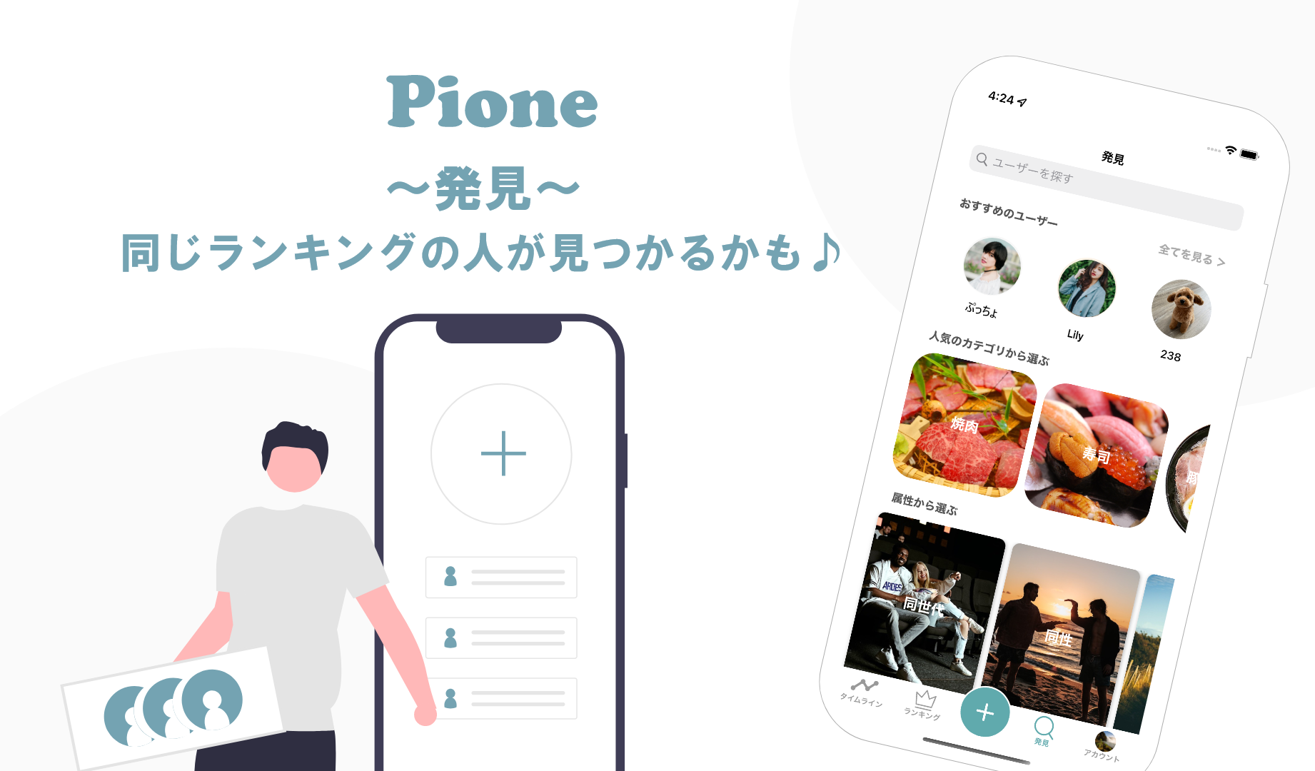 「Pione ピオーネ」において、ユーザーを発見する際に、ユーザーの好みに最もマッチしたユーザーをレコメンドするアルゴリズムを導入しました。ユーザーが投稿している内容(投稿ランキング、投稿タイトル)から、マッチ度を算出し、おすすめのユーザーとして表示します。