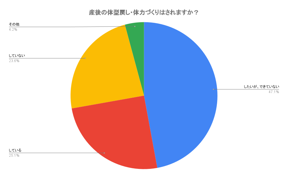 2022年9月に当社が実施した「産後の運動に関する調査」では、アンケートに回答したママの約半数が「産後、運動をしたいができていない(47.1%))」と回答し、運動できない理由には、頼れる人が近くにいない、子どもを預けるサービス利用への抵抗感等が浮き彫りになりました。