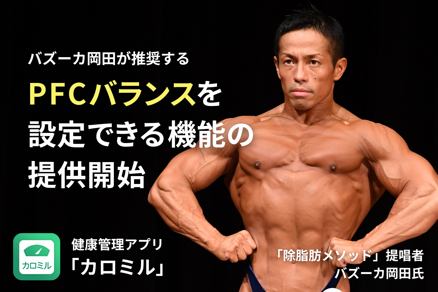 食事管理を身近なものにしていくために、カロミルでは恒常的に記録機能の改善等を進めており、今回はバズーカ岡田先生の「除脂肪メソッド」に基づくPFCバランスを設定する機能を搭載いたしました。カラダをつくる上で、トレーニングと同様に重要である栄養管理の目標値をユーザーの皆様にも簡単に設定いただき、従来以上に、食事管理を身近なものにしていただきたいと思っています。