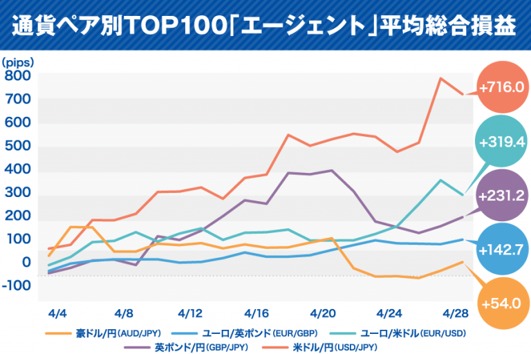 4月度のTOP100「エージェント」の成績を通貨ペア別に見ると、米ドル/円のTOP100「エージェント」が最も安定的に利益を伸ばしました。