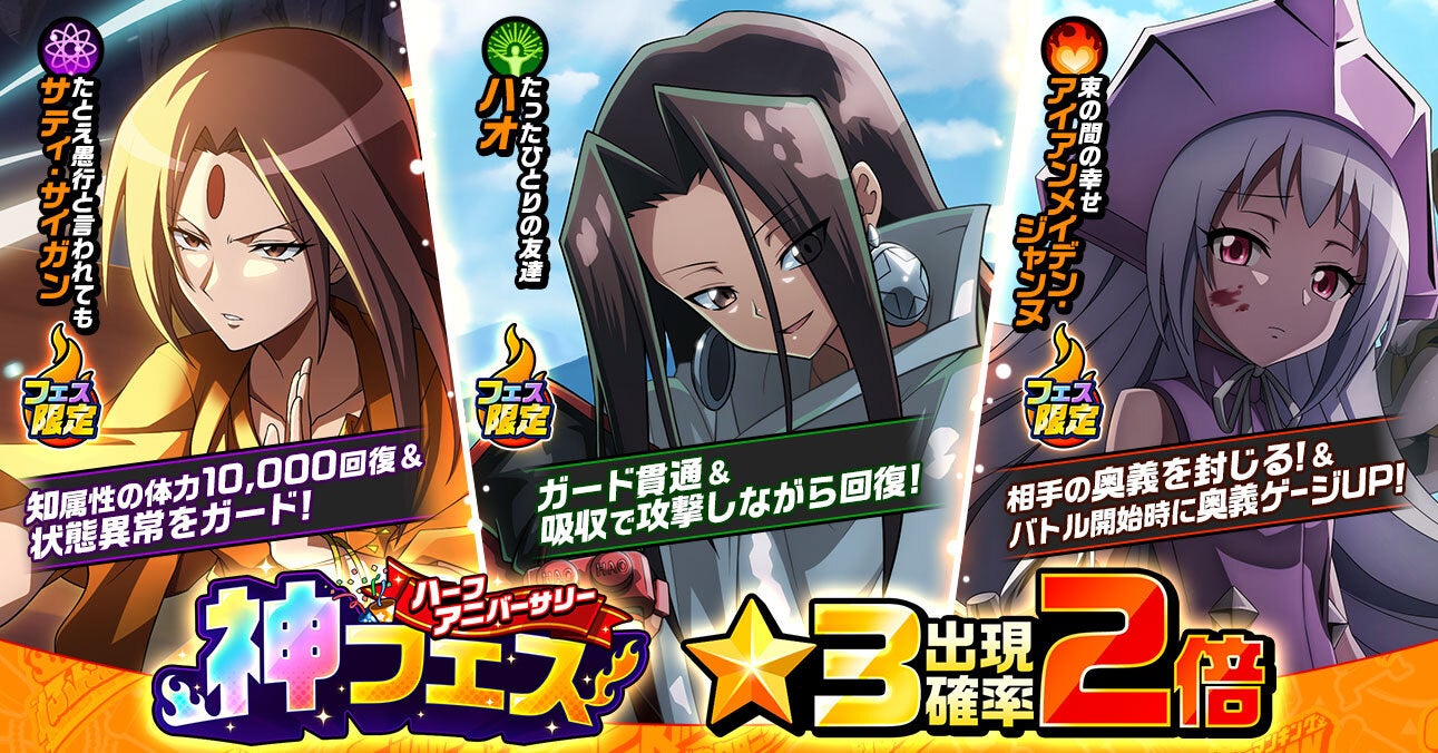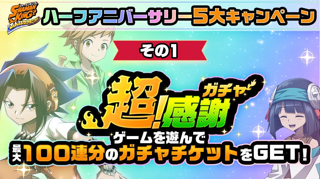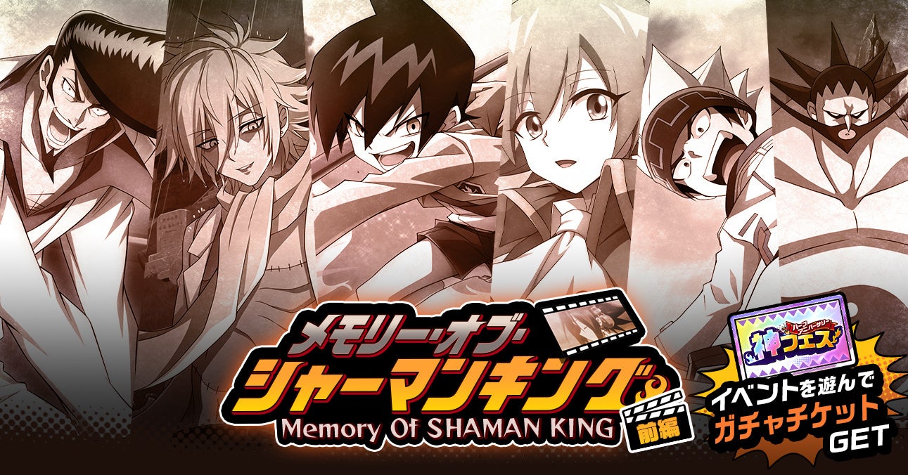 『SHAMAN KING』の原作を再現したバトルを追体験できるイベント「メモリー・オブ・シャーマンキング(前編)」を開催いたします!イベントのクリア報酬であるイベントコインをGETして、イベント交換所で利用しましょう。イベント交換所には、同時開催の「神フェス」ガチャを無料で利用できる神フェスガチャチケットが5枚含まれるなど、大変お得なラインナップとなっております!