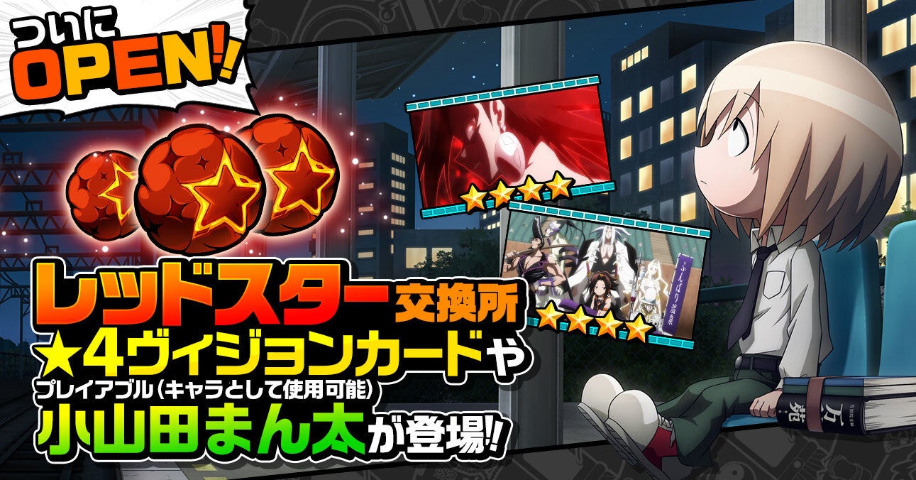 レッドスターの交換所がついに登場します!集めたレッドスターは★4のヴィジョンカードや、プレイアブルキャラの「小山田まん太」と交換することが出来ます。