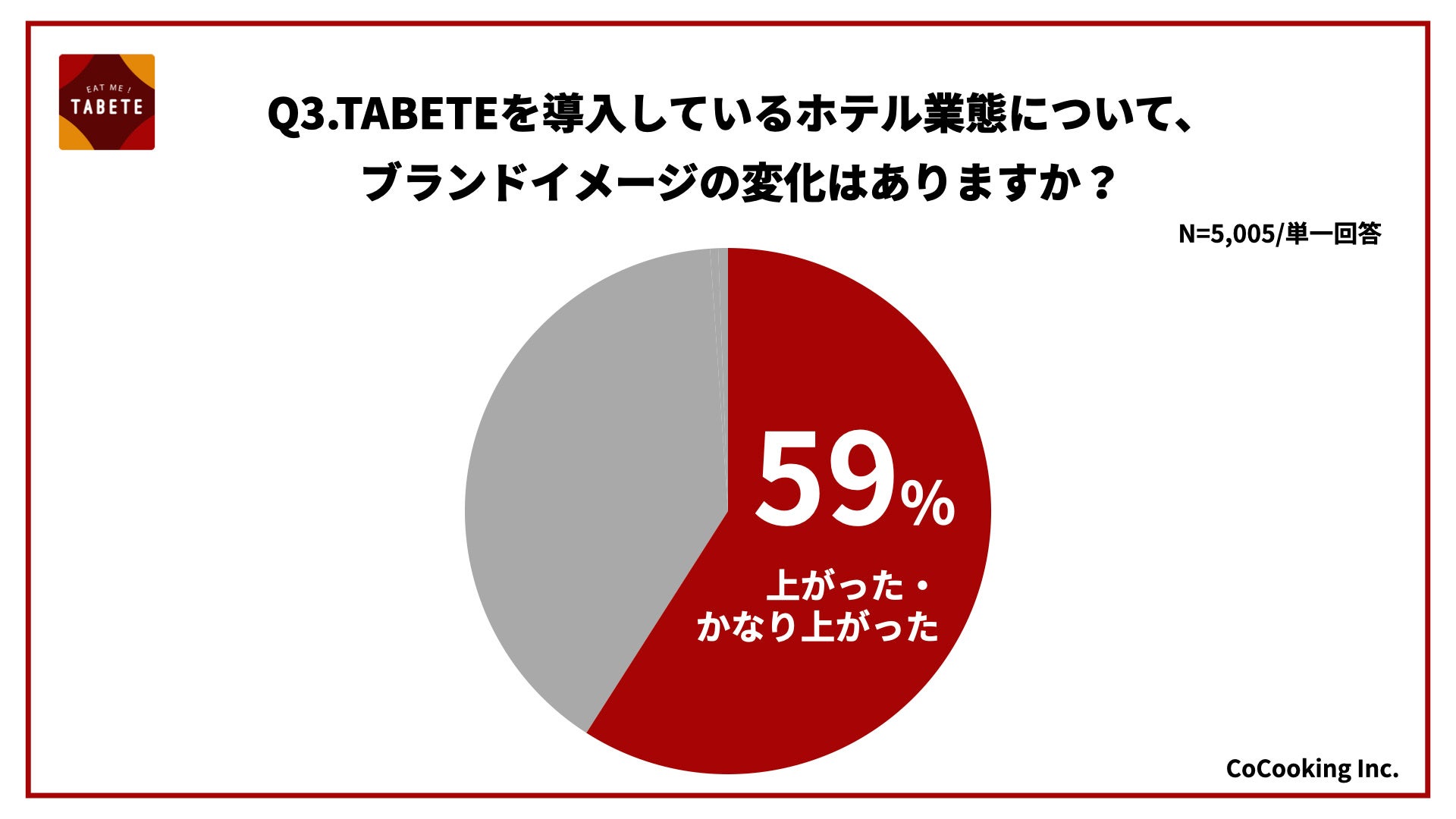 TABETEユーザー約5,000人へ、「ホテルがTABETEを導入後、ブランドイメージに変化はあったか」をアンケート調査した結果、59%が「上がった」と回答しました。