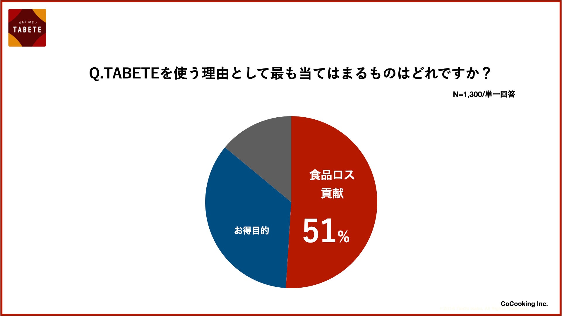 TABETEユーザー約1,300人へ、「TABETEを使う理由」をアンケート調査した結果、51%が「食品ロス削減に貢献したいから」と回答しました。