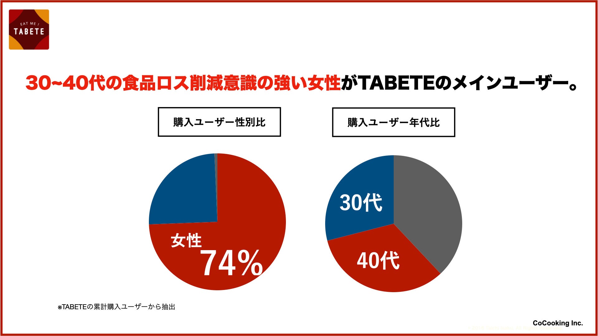 TABETEの購入ユーザーは、7割以上が女性で、特に30,40代の方々が中心です。食品ロスへの貢献心や環境意識の高いユーザーさんがメインユーザーであることが特徴です。