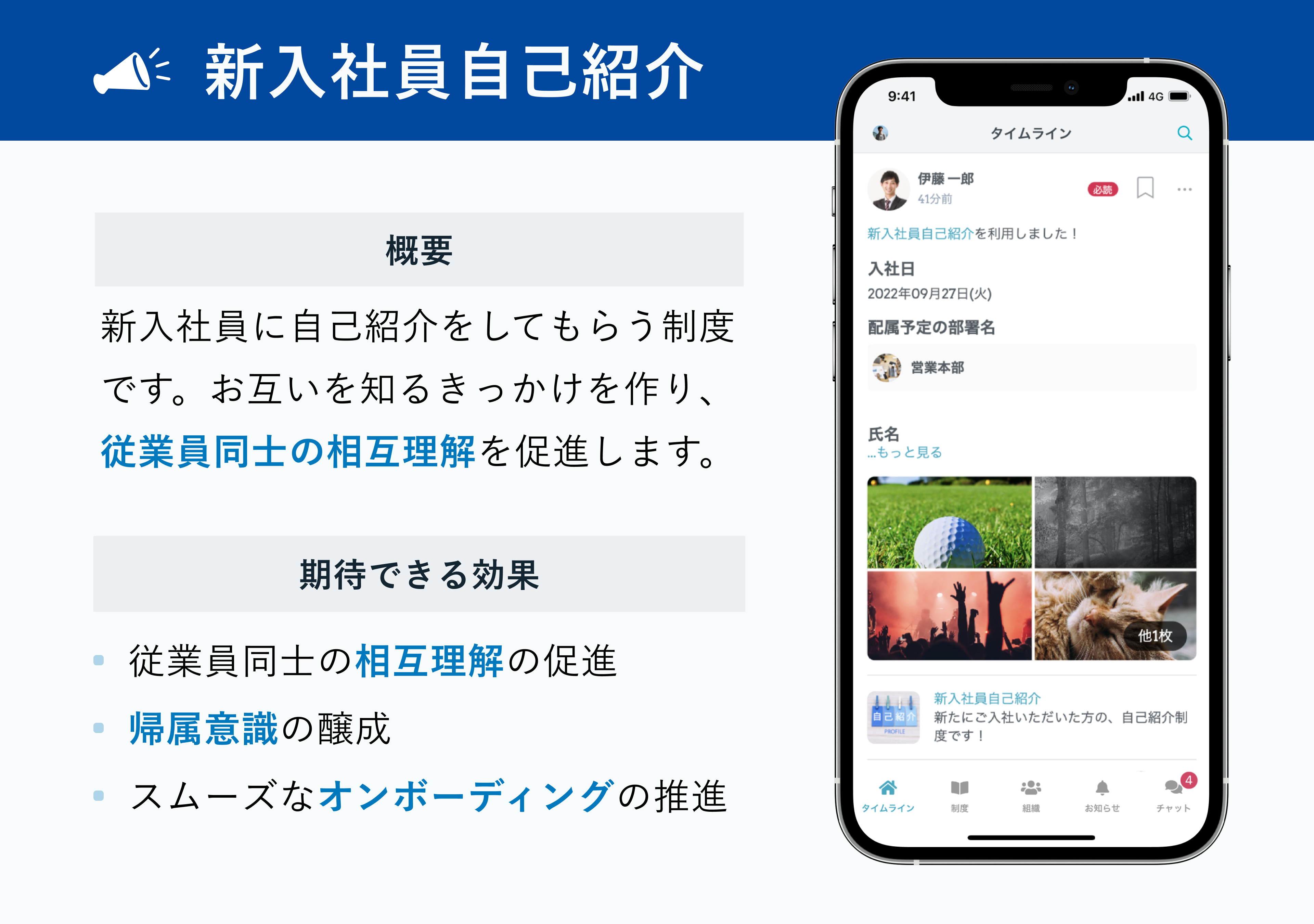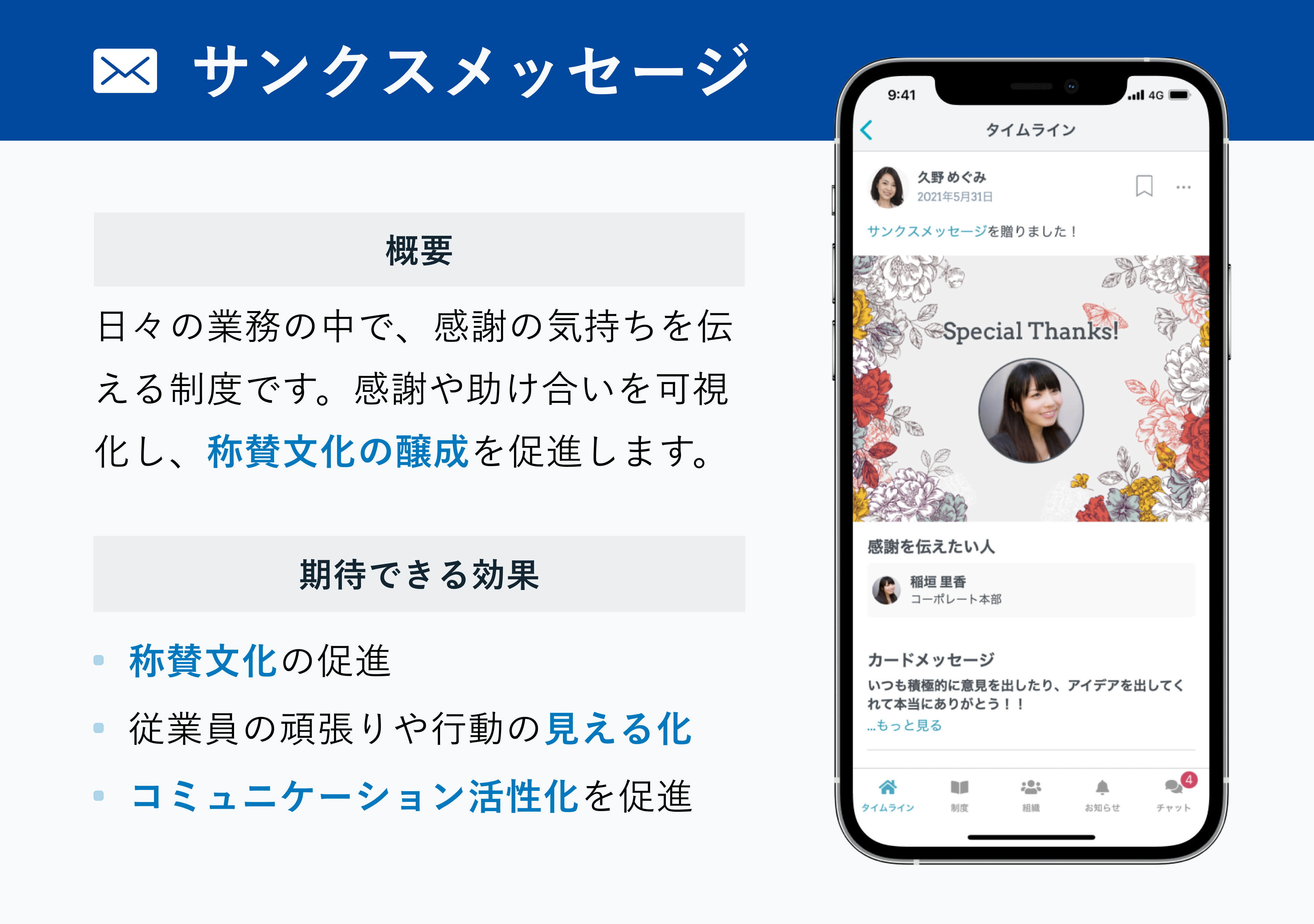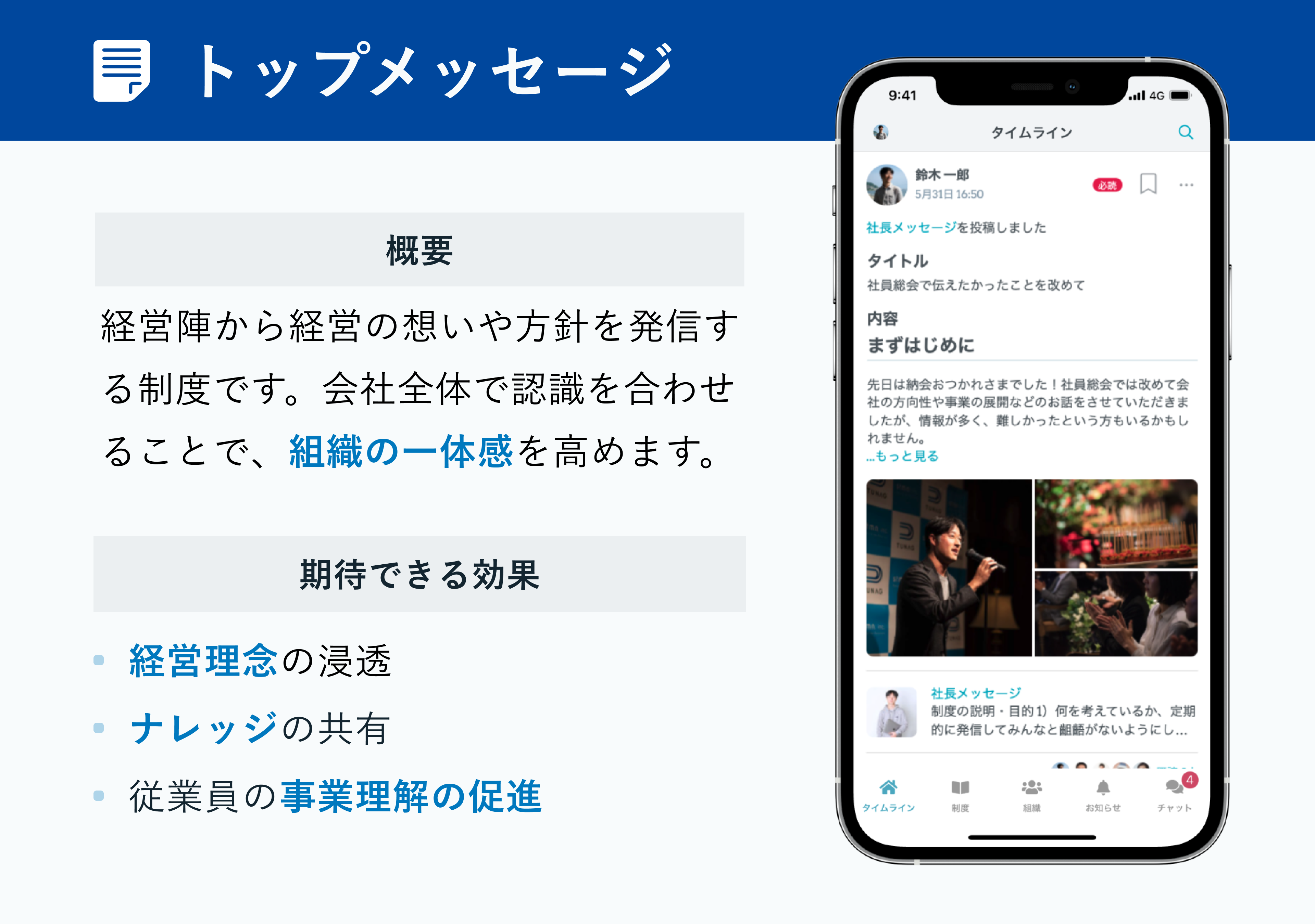 情報共有や理念浸透の取り組みを、Webブラウザ・スマートフォンアプリのプラットフォーム上で運用し、日常的にコミュニケーション活性化に取り組めます。